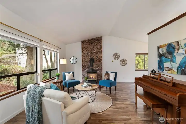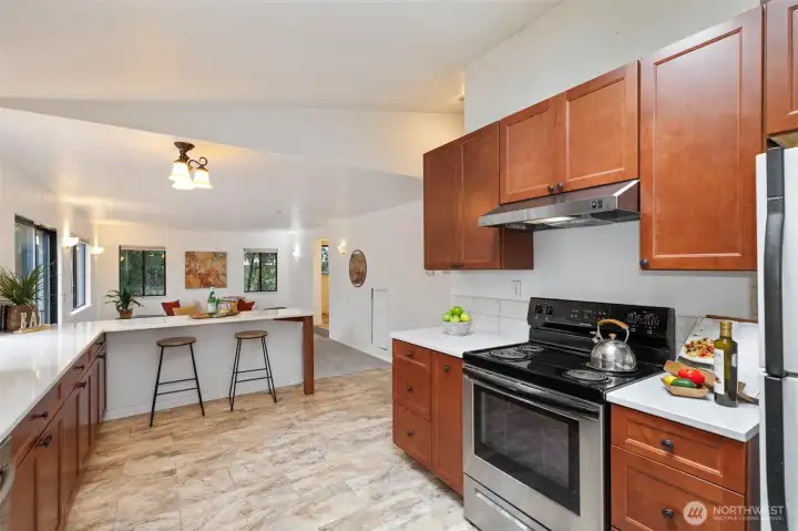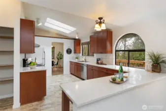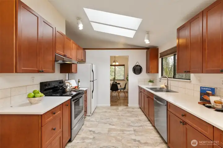 Move-in ready 3 bedroom Bremerton home! Open and bright with vaulted ceilings, skylights, formal living room with fireplace, and dining room. Beautifully updated kitchen with quartz countertops, breakfast nook, and low-maintenance vinyl flooring. Cozy family room, plus 1/2 bath on main floor. Upstairs you’ll find a large primary bedroom with walk-in closet and full bathroom. Plus, two guest bedrooms and additional full bath. Enjoy the spacious backyard with large deck, garden space, and fruit trees that backs up to community greenbelt for added privacy. Perfect location within minutes to community parks, dining & shopping, highway, Navy bases and ferries for quick commute.