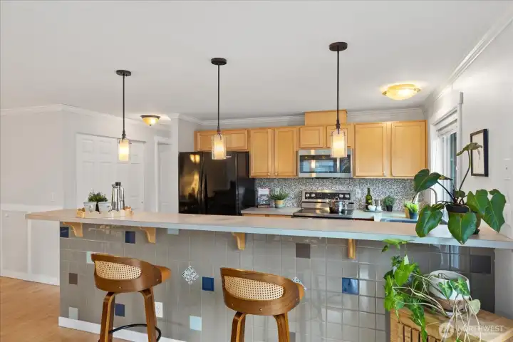 Sunny and bright, this well-maintained single-story home boasts many custom, energy-efficient upgrades. The open and spacious floorplan features beautiful hardwood maple flooring and garden views throughout the house. The large primary suite includes a sitting area, primary bath with a double-headed shower, built-in storage/bookshelves/desk, a large walk-in closet, and French doors that open onto a lovely garden patio This home has a newer roof (1/2025), solar panels (1/2024), newer appliances, and a fully fenced yard. The garage features built-in cabinetry and work counter, overhead storage, a utility sink, and access to the side yard with a garden shed for extra storage. Enjoy the outdoors in two private garden sanctuaries, a covered front porch, and grass for pets and kids. A heat pump and central AC keep you warm and cozy in the winter and cool and comfortable in the summer. This home is situated close to the ferry, community center, shops, restaurants, Port of Kingston Marina, and recreational fishing and crabbing. The current owner developed an income stream utilizing the primary suite as an AirBnB.