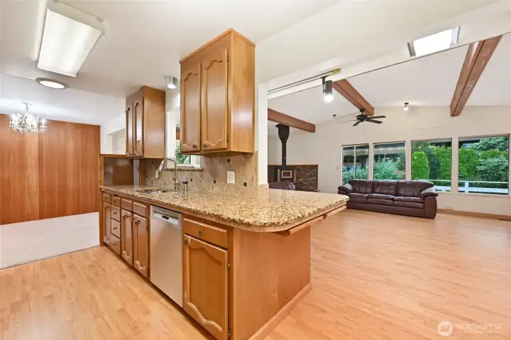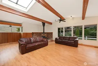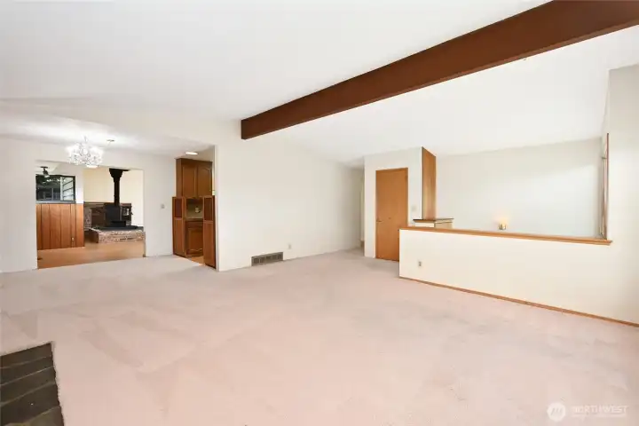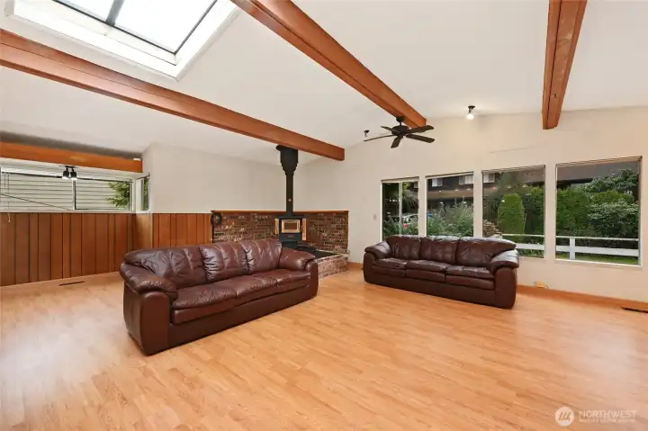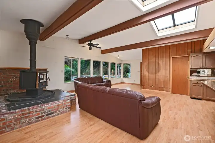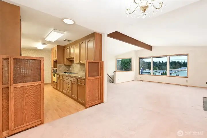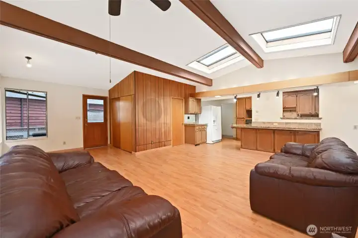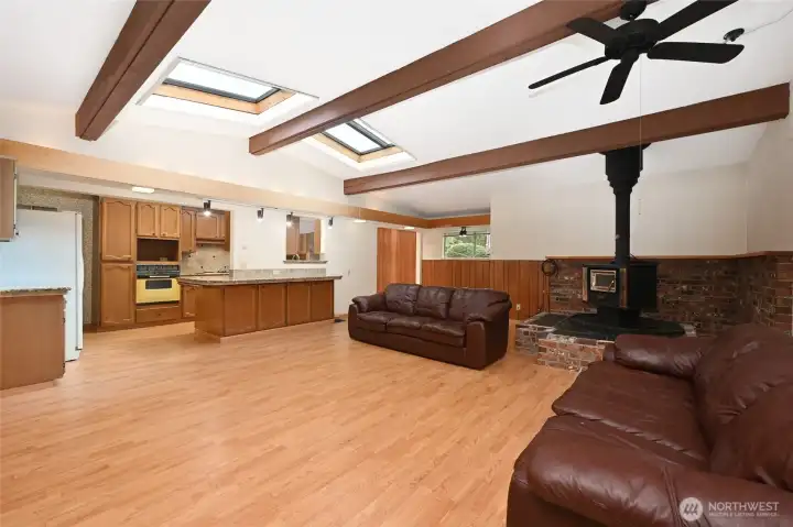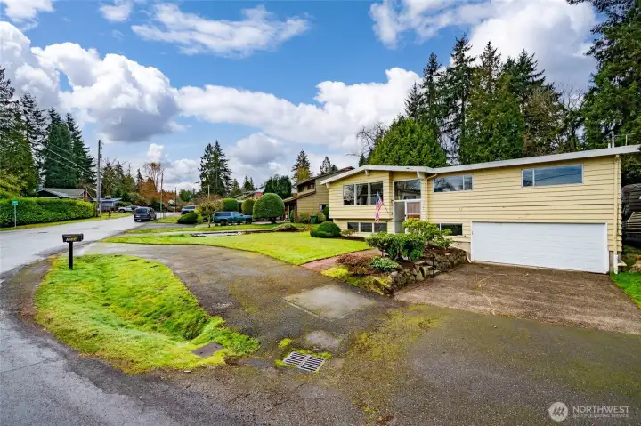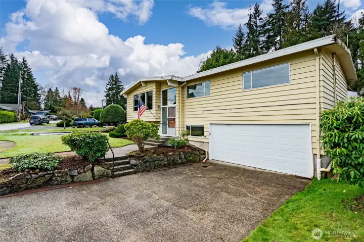 Investor opportunity! Charming mid-century estate home in Olympic Hills neighborhood offering space, character, and endless potential for your personal updates and vision. This 3-bedroom, 2.25-bath features 2,980 total sq ft (2,410 finished) with light-filled living areas and classic architectural details throughout. Bright living spaces feature large windows, warm wood accents, hardwood floors under the upper-level carpet, and a cozy wood-burning fireplace. A functional kitchen that flows into a huge family room with skylights, creating a light-filled space for everyday living and entertaining. Downstairs you’ll find the large rec room - ideal for a media room, hobbies, or multi-generational living, along with ample storage and unfinished space for future expansion. Recent improvements include newer sewer line (2008), copper plumbing, electric heat pump, and waterproofed basement. Enjoy year-round outdoor living on the covered deck and a spacious yard perfect for entertaining or gardening. Extra-long driveway with RV parking. Convenient location with easy access to I-5, parks, and neighborhood amenities. Sold as-is with incredible upside potential.