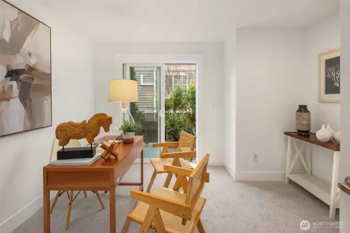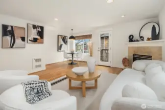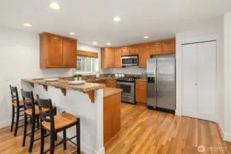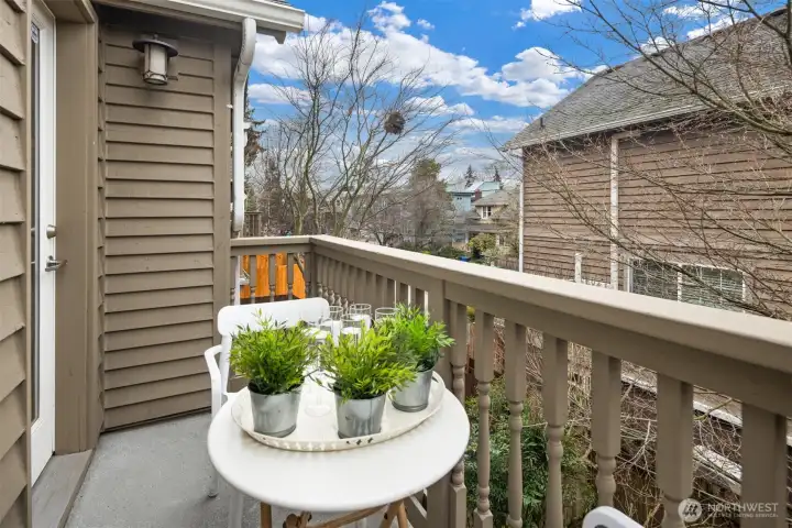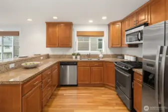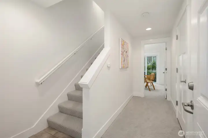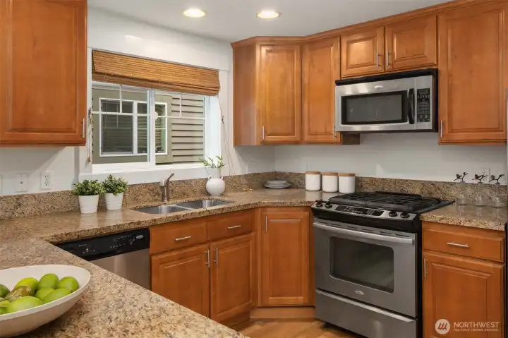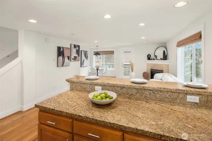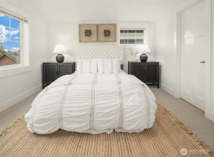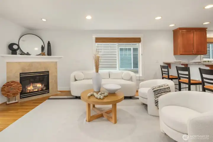 Beautifully crafted end-unit townhome perfectly situated on a quiet dead-end street in the convenient Northgate neighborhood. Unlike typical narrow layouts, this home offers a wide, open main floor featuring a chef’s kitchen with abundant cabinetry, granite countertops, gas cooking, and stainless steel appliances. The spacious dining area flows seamlessly into the sun-filled living room with a cozy gas fireplace and access to a private balcony. Upstairs, the vaulted ceilings enhance the sense of space in both the large primary suite with large walk-in closet and secondary bedroom, complemented by a well-appointed full bath. A generous laundry room with built-in drying racks is a rare find. The lower level includes a third bedroom with an en-suite ¾ bath and direct access to the attached one-car garage. Step outside to enjoy a private, fully fenced, low-maintenance yard, perfect for outdoor relaxation or entertaining. New interior and exterior paint and brand-new carpet throughout. Minutes from Green Lake, Licton Springs Park, North Seattle College, and the light rail station, offering an easy commute to SLU and downtown Seattle. Close to shopping, dining, and all neighborhood amenities. No HOA!