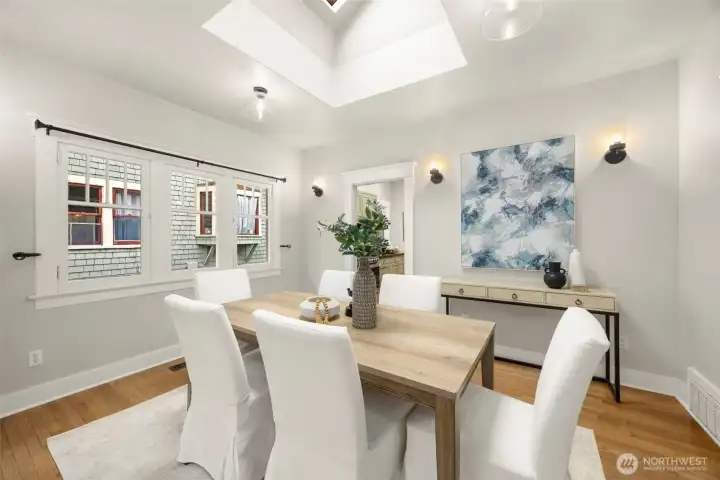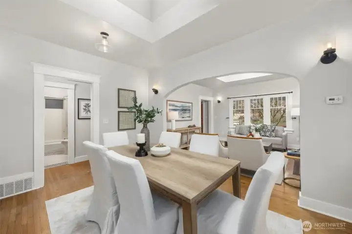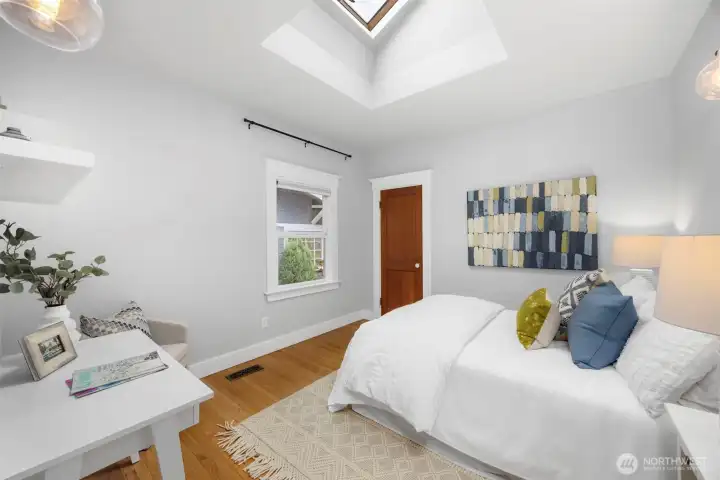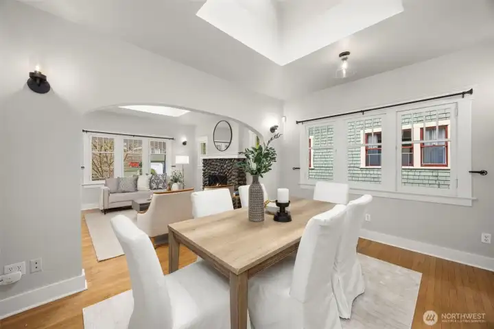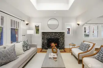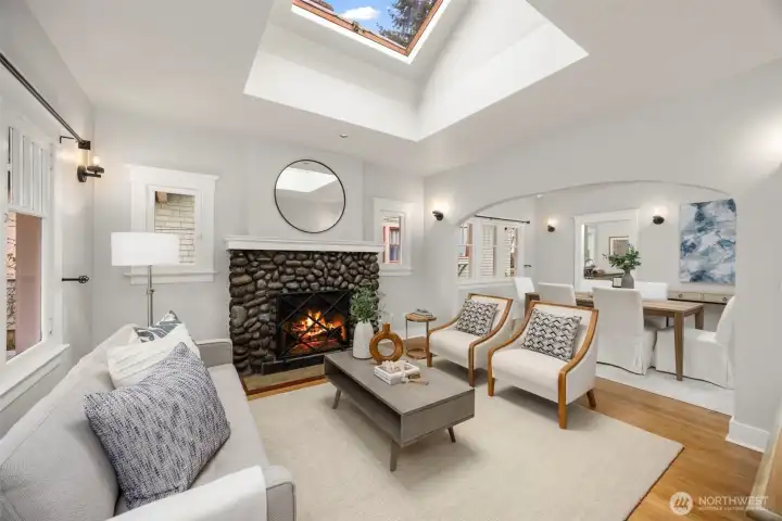 This quintessential Wallingford Craftsman home checks ALL the boxes. Beautifully maintained and quiet throughout, fall in love with extra bright, sky-lit rooms, soaring ceilings, and stunning river rock fireplace. Conveniently perched above the street, a charming covered porch welcomes you, offering both privacy and a place to sit and take in the sweet garden and neighborhood views. The seamless layout makes practical use of every square inch of this home, including two distinct living spaces, a galley style kitchen with granite countertops and gas range, and an extra office or flex space. Timeless details are abundant, like original hardwood floors, picture windows, and crown moulding. An extra large garage has room for both cars, toys, and workspace, and the flat, fully-fenced backyard is a wonderful space to garden, play or entertain. Located just blocks to all of the bustle of 45th, Green Lake, the University District, and a very short commute to both Downtown Seattle and Bellevue.