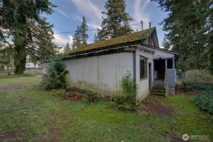 Opportunity knocks in North Marysville. Roll up your sleeves and unlock the potential of this 1925 built, 1½-story home offering 944 sq ft on the main floor, 1 bedroom, 1 bathroom, Kitchen and Living room with gas fireplace on a 19,166 sq ft lot backing to a creek down near west property line. Features include unfinished attic with expansion potential, basement-sized crawl space, detached 2+ car garage with shop space, and an attached carport. Roof replacement needed, furnace is gas but needs repair, plumbing leaks have resulted in the home being winterized. Water is currently supplied by a well (pump shut off). **** City Water / Sewer Information ****City water and sewer are available in the street. The existing on-site drain field has failed and cannot be renewed; connection to city sewer will be required. Natural gas is connected to the home. Buyer to verify utility availability, connection requirements, capacity, fees, and all related information with the City of Marysville. The property provides an opportunity to invest into an established location while adding value through improvements. Priced to sell at appraised value of $420,000. Buyer to verify zoning, square footage, utilities, and all future use options. The home has not been updated since the 1970s and presents a true renovation or redevelopment opportunity. Sold as-is.