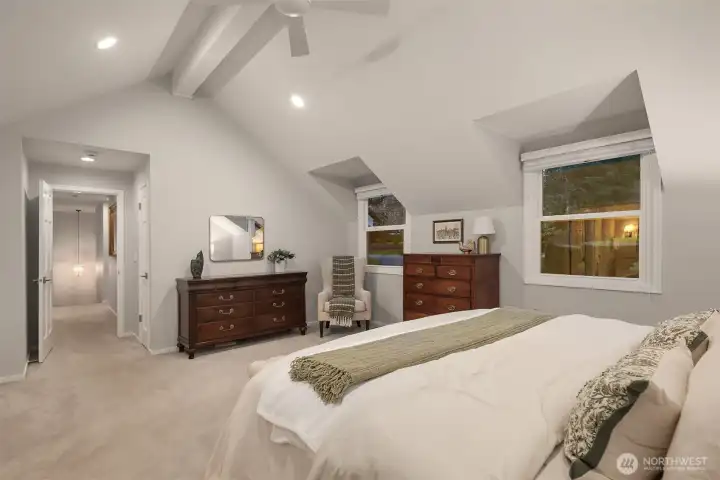 Located in CorSun Ranch, this Buchan-built Craftsman offers a private setting w/mature landscaping and an exceptional layout. Featuring nearly $500,000 in updates throughout. Main level offers vaulted ceilings, two living areas, and an updated kitchen with beautiful cabinets, new sink window & updated appliances. Formal dining and an expansive deck overlook a backyard oasis. Find 4 bedrooms up, including a primary suite with soaking tub, custom cabinetry and stone countertops. Recent improvements include new furnace, air conditioning, tankless water heater, energy efficient windows, hardwood floors, custom closets, updated lighting/plumbing and a rebuilt fireplace. Take advantage of the partially finished basement for a future media room or wine storage. Conveniently located near I-405, Lake Wash schools & major employers
