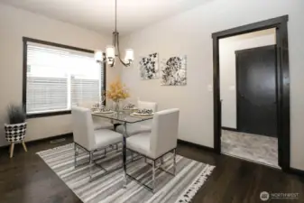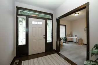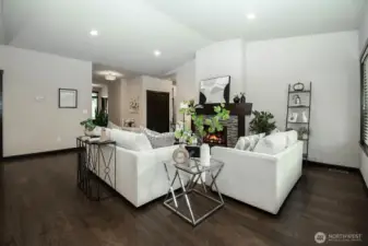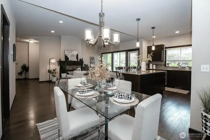 Nestled on a generous lot, this beautifully kept rambler offers the finest in single-level living by blending style and comfort with timeless elegance. Gleaming hardwood floors, wood-wrapped windows, and soaring cathedral ceilings create a warm, sophisticated atmosphere, while high-end finishes provide modern convenience. The chef’s kitchen features stainless-steel KitchenAid appliances, slab granite countertops, and a large granite island, along with a sunny dining area that flows seamlessly into the family room with a cozy gas fireplace, creating a bright, open great-room concept ideal for everyday living and effortless entertaining. Just off the entry, a spacious office with French doors is perfect for working from home or as a hobby space. Down the hall you will find three bedrooms including a serene Primary Retreat with a large walk-in closet and spa-like en-suite bath with a walk-in shower. Outside, enjoy a private, fully fenced backyard with a spacious covered patio overlooking beautifully manicured landscaping, perfect for outdoor dining and relaxation. Additional features include a double-car garage with storage racks, paved RV parking, and zero-grade, curbless entry with wide hallways and doors for accessibility and convenience. Located in a desirable enclave of single-story homes, all just minutes from the Downtown Everett Waterfront, Everett Mall, top-rated schools, shopping, and restaurants.