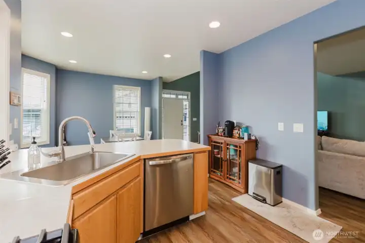 Well-maintained 2,112 sq ft home in the desirable Village at Union Mills. This unique floor plan offers a spacious primary suite, 2.5 baths, and flexible living areas. Vaulted ceilings, skylights, and a cozy gas fireplace create a bright, inviting main living space. Kitchen opens to dining and great room with French doors leading to a private, fully fenced patio. Features include laminate/vinyl flooring, wall-to-wall carpet, jetted tub, walk-in closet, utility room, central A/C, heat pump, and forced air heating. Attached 2-car garage, sprinkler system, and low-maintenance lot. HOA includes common area maintenance. Conveniently located near I-5, transit, shopping, dining, and North Thurston schools.