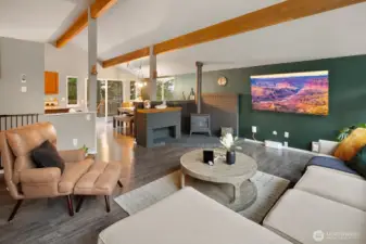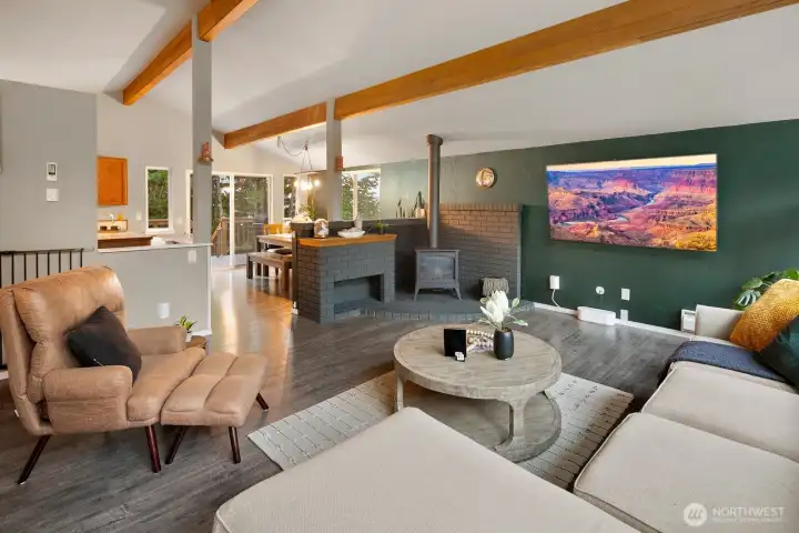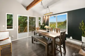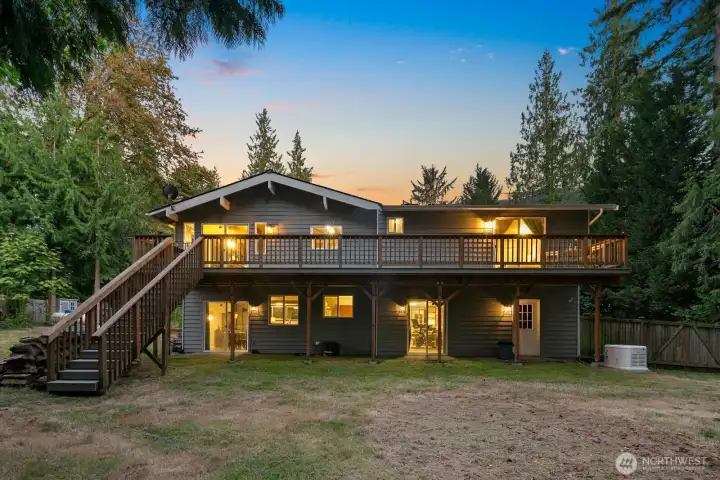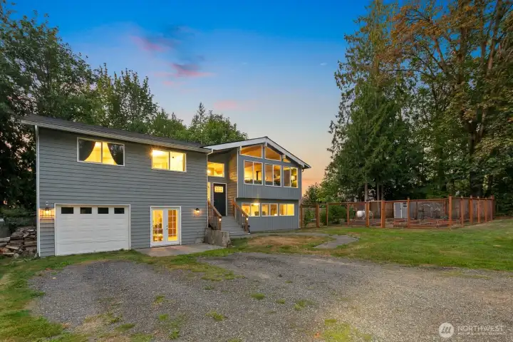 A truly rare offering on Machias Ridge, this exceptional two-parcel estate spans over 5 acres and captures beautiful territorial views in a private, peaceful setting surrounded by nature. The spacious split-level home has been thoughtfully updated throughout, including new electrical, a whole-home generator, new fireplace, updated flooring, and new windows—offering modern comfort while maintaining its warm, inviting character. The main level showcases vaulted ceilings accented by dramatic wood beams and an open-concept layout filled with natural light, seamlessly connecting the living, dining, and kitchen spaces for effortless everyday living and entertaining. The lower level is designed for entertaining and flexibility, featuring a built-in bar with seating, a comfortable lounge area, and a versatile flex room with both a slider and French doors—ideal for a home office, gym, guest suite, or media room with direct outdoor access. An attached and detached garage provide generous parking, storage, or workshop space, perfect for hobbyists, recreational vehicles, or additional equipment. With an RV hookup, expansive grounds, and ample room for outdoor enjoyment, gardening, or future expansion, this property delivers a rare combination of privacy, functionality, and scenic living in a highly desirable Machias Ridge location.