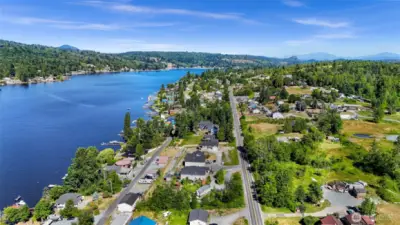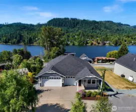 Stunning Big Lake view custom built home on 1.12 acres with sweeping 180° lake vistas. The main level is designed for everyday comfort and effortless entertaining, featuring an open living and dining area framed by expansive lake views, two bedrooms, and a lake-facing primary suite with private deck access and an attached office that can easily convert to a third bedroom. The kitchen offers stainless steel appliances, granite countertops, and an oversized island with generous bar seating, flowing seamlessly into the living space and enclosed sunroom. Step outside to the expansive deck and take in the incredible lake scenery—ideal for entertaining or enjoying the view year-round. The lower level provides approximately 700+ sq ft of additional living space with two bedrooms, a second full kitchen, private entry, and extra parking—perfect for guests or multi-generational living. The property also includes a detached 400 sq ft tiny home with its own parking and natural privacy, ideal for Airbnb income, guest use, or rental opportunities. Two additional detached, fully finished spaces offer flexible options for home offices, studios, or private retreats. Beautifully landscaped grounds feature pergolas, a waterfall, fire pit, and potting shed, creating a true outdoor sanctuary. Immaculately maintained and thoughtfully designed, this rare Big Lake retreat blends comfort, versatility, and the very best of Northwest living. A must-see to fully appreciate all this property offers.
