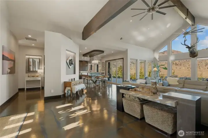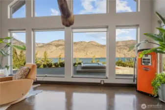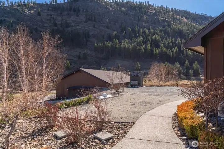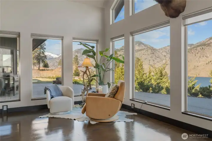 Experience elevated Pacific Northwest living in this one-owner custom rambler set on 2.5 private acres with sweeping Lake Chelan and mountain views from every room. Designed for effortless one-level living, this 2,652 sq ft home blends luxury craftsmanship with functionality and is ideal for entertaining. Soaring ceilings, exposed wood beams, radiant heated concrete floors throughout (including garage), expansive windows, a DaVinci linear fireplace with LED lighting, and in-wall surround sound create an inviting living space. The chef’s kitchen features Huntwood cabinetry, granite countertops, electric double oven, propane DCS cooktop, 1300 CFM hood, built-in ice maker, wine refrigerator, Miele espresso machine and microwave, Thermador refrigerator, and Sub-Zero freezer drawers. The oversized island is designed for gathering. Dining includes a built-in wood table with LED lighting. Office/den with built-ins and barn door. Primary suite offers 11’ ceilings, patio access, spa bath with dual vanities, walk-in shower with multiple heads, and his and hers closets. Outdoors include privacy, expansive views, flat land, irrigation, BBQ hookup, jetted hot tub, RV parking with electrical hookups. The 2,800 sq ft insulated shop features oversized 12x16 doors, bathroom, washer/dryer, 220 power, radiant heat, air compressors, and 30-amp hookups- ideal for hobbyists, toy and equipment storage, or future expansion. A rare blend of privacy, efficiency and luxury living. Lake Chelan's finest!