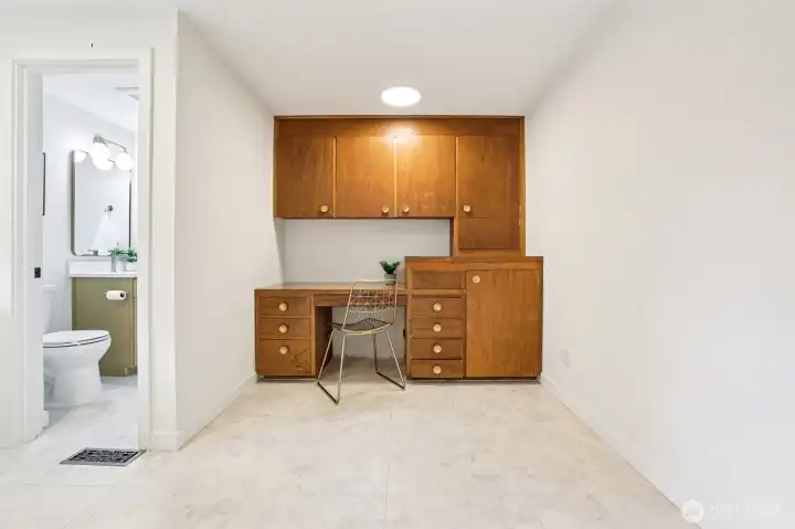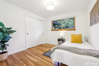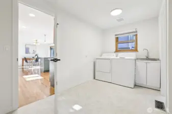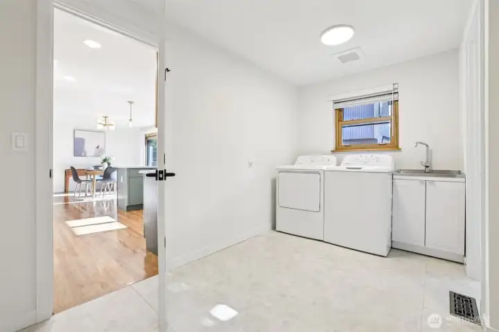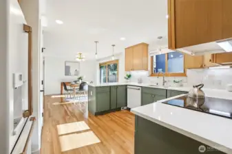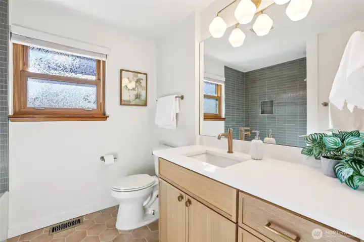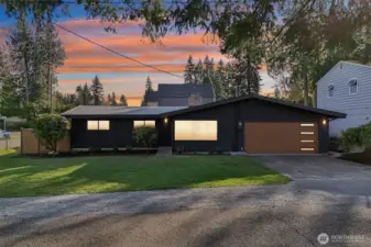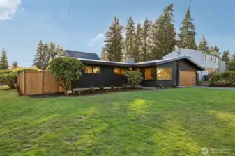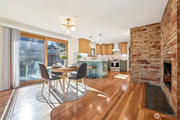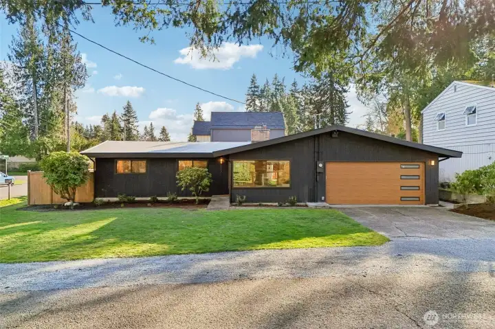 This charming midcentury rambler has been thoughtfully updated. You will love the stylish, refreshed kitchen with subtle color and elegant fixtures, along with striking new cabinets, counters, and appliances. The spacious living and dining areas feature a double-sided fireplace, refinished hardwoods, and large windows that bring in abundant natural light. Enjoy the generous bedrooms and beautifully tiled bathrooms. An oversized laundry room with a wall of cabinets provides flexible space for projects, working from home, or a mudroom drop zone. A newly installed heat pump delivers efficient electric heat and air conditioning for year-round comfort. Additional updates include a new roof, sewer liner, and upgraded electrical panel and service. The fully fenced, level backyard and attached two-car garage offer added convenience and storage. All this on one level! Move-in ready, this home blends classic charm with modern upgrades. Located near excellent Shoreline and Kings schools. Welcome home!