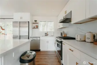 Fully remodeled and move-in ready, this beautifully updated split-entry home sits on a quiet street of well-maintained residences and delivers modern style, comfort, and flexible living. Major upgrades include new windows and a new roof (2022), plus a fully updated HVAC system with A/C for year-round comfort. The home has been thoughtfully refreshed throughout with LVP flooring, quartz countertops, custom cabinetry, and updated fixtures and finishes. Both the kitchen and bathrooms have been remodeled, and the updated deck creates the perfect space for indoor-outdoor living. The main level features a bright, open living area with a cozy fireplace, dining space with deck access, and three bedrooms, including a private primary suite with a 3/4 bath. Downstairs offers exceptional versatility with a spacious rec room, a full second kitchen, plus two additional finished rooms—ideal for home offices, guest space, gym, hobby rooms, or added storage. Enjoy a large, level lot with a generous backyard in a neighborhood known for wide streets, sidewalks, and a welcoming community feel. Conveniently located close to shopping, schools, parks, and easy commuting routes. A true turnkey home with high-end finishes and flexible spaces—ready to enjoy from day one.
