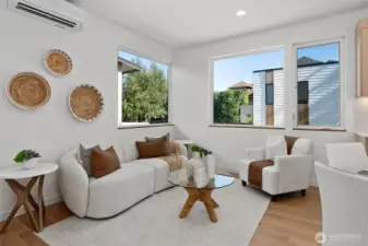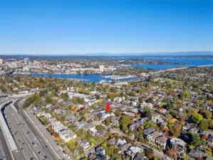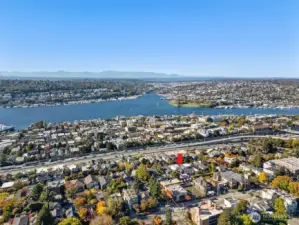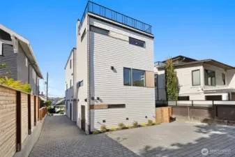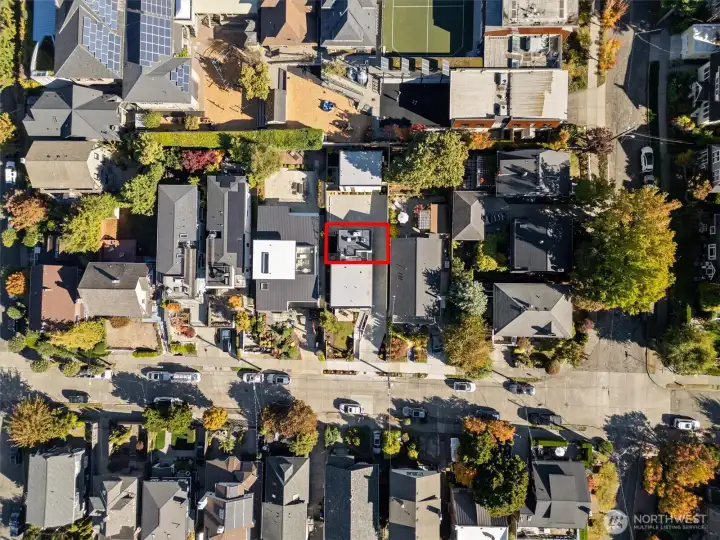 ON A QUIET RESIDENTIAL STREET! Featured in Architectural Digest, this Pivotal Homes build delivers modern design w/ elevated craftsmanship. Soak in panoramic rooftop views of the Seattle skyline, Lake Union, & Olympic Mountains—a daily dose of wow. Inside, light-filled interiors & white oak floors create an easy, refined vibe. The custom kitchen w/ premium appliances anchors the open living area, perfect for gatherings or quiet nights in. A/C throughout keeps comfort on point. Upstairs, the primary suite is your sanctuary w/ a spa-inspired bath, dual vanities, and generous closets. A main-level bedroom & full bath open to a private fenced patio, ideal for guests or flex use. EV-ready parking and a storage room complete the package.