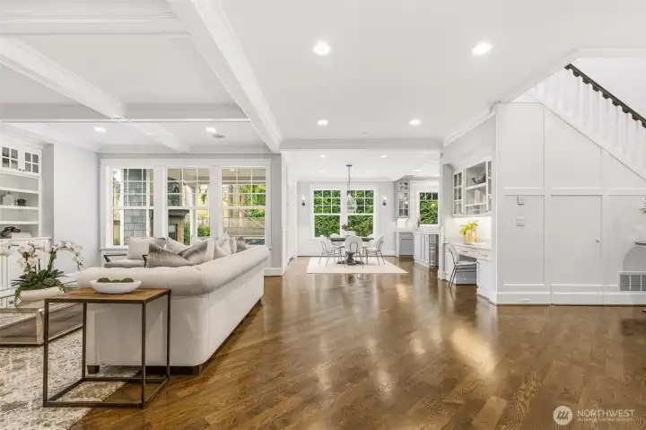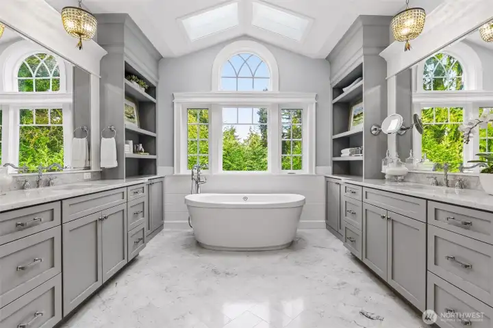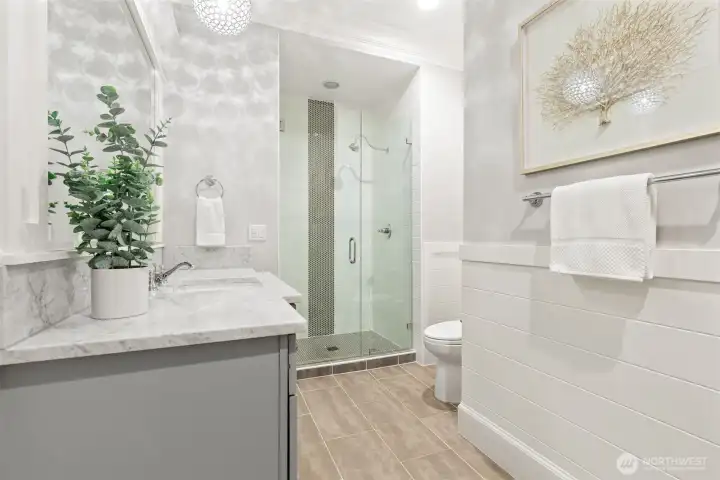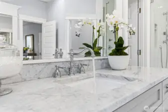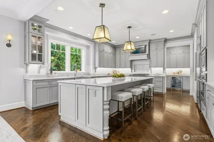 Welcome home to refined elegance and timeless appeal, where thoughtful design and exceptional craftsmanship are evident at every turn. The chef’s kitchen is beautifully appointed with custom cabinetry, marble countertops, premium appliances, a walk-in pantry with an additional refrigerator, and a butler’s pantry perfect for seamless entertaining and everyday living. Natural hardwood floors flow throughout the home, creating warmth, continuity, and a classic aesthetic. The main level offers a versatile bedroom/den with an ensuite, ideal for guests or a private office, along with dining area and great room designed for comfort and style. Upstairs, the bonus room showcases views of downtown Bellevue, providing an inspiring space for relaxing or working. The primary suite is a true retreat, featuring a spa-like marble bathroom with exquisite finishes, a luxurious soaking tub, and a massive walk-in closet. This home is equipped with separate heating and cooling systems for each floor, ensuring personalized comfort and energy efficiency. Built with superior workmanship and attention to detail, the quality of construction is evident in every finish and feature. Step outside to a private backyard at the end of the cul-de-sac, where you can unwind in the hot tub and enjoy the peaceful setting. Just steps from all that downtown Bellevue has to offer, this home perfectly blends luxury, comfort, and location. Come see and make it yours.
