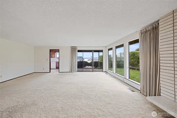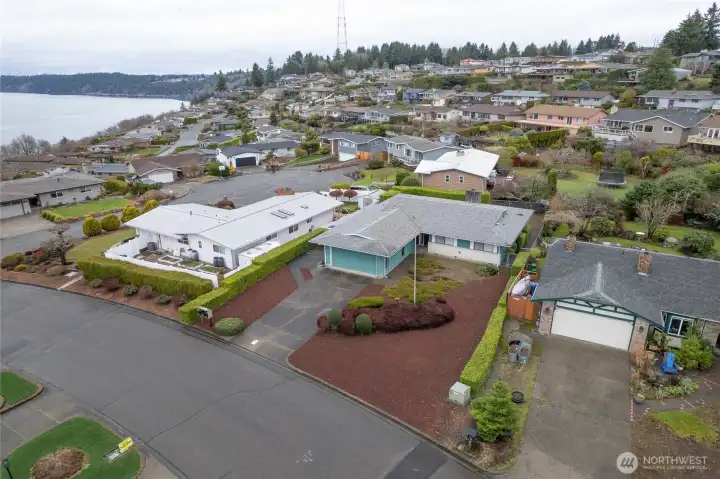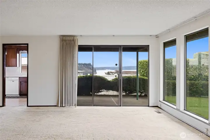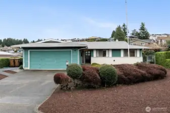 Located on Vista View Drive, this well-maintained 1971 home offers mid-century character, generous living spaces, & beautiful Puget Sound views. With 1,610 sq. ft. of living space plus a 500 sq. ft. two-car garage, this home provides a solid layout & excellent potential for cosmetic updates. The main living area serves as the heart of the home, oriented toward the view & anchored by a striking brick fireplace, with plenty of space for flexible furniture arrangements. A sliding glass door opens from the main living area to a covered patio, extending the living space outdoors & creating an ideal setting for dining, grilling, & relaxing while taking in views of Gig Harbor & the Puget Sound. Just off the living room, the kitchen is bright & welcoming, featuring a window over the sink with more water views. Largely original finishes create a blank canvas for future updates, while the adjacent flex room adds versatility for dining, work, or reimagining the layout. The primary bedroom features a walk-in closet and private ¾ bath, while two additional well-sized bedrooms share a full hall bathroom. This home is an ideal opportunity for your cosmetic updates in a desirable view location! Don't miss it!