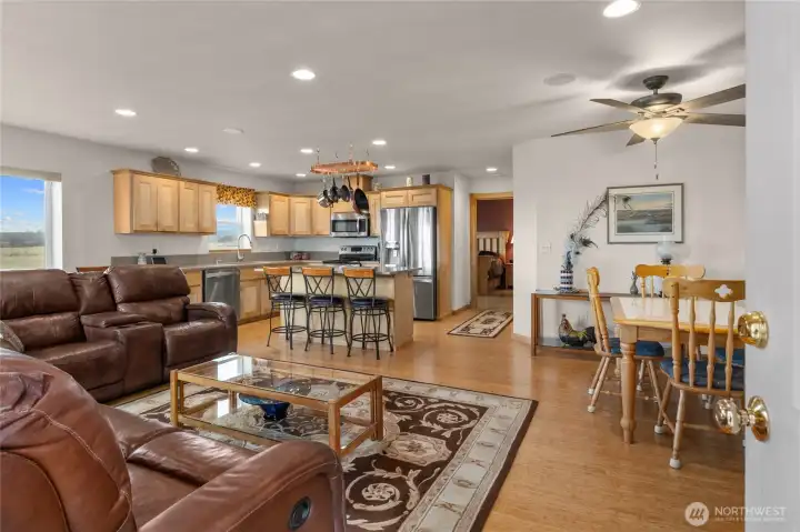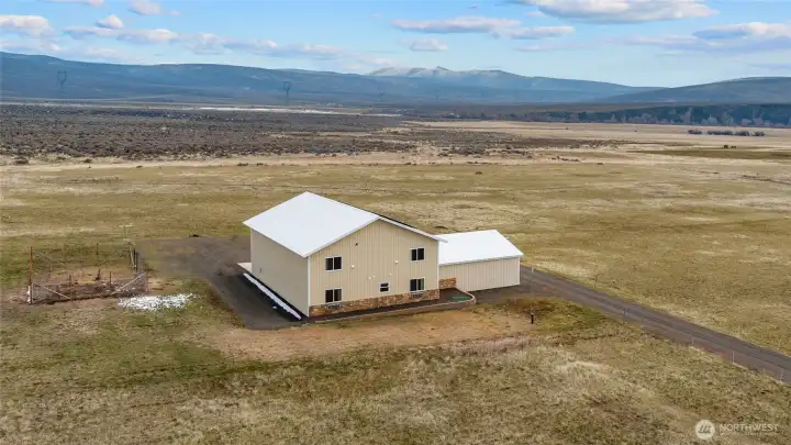 Set on 6 peaceful, fully fenced acres with sweeping mountain views, this one-of-a-kind 1,684 SF shopdinium blends comfort, freedom, and function. Wake up to quiet mornings and wide-open skies, then gather in the light-filled great room featuring granite countertops and stainless steel appliances. One bedroom is on the main level, while upstairs offers a second bedroom and an inviting entertainment area—perfect for hosting or relaxing after a day outdoors. A spacious shop/garage with 14-ft doors, plus a small attached garage, provides room for toys, projects, or passions. Solar panels enhance energy efficiency. Tucked into a peaceful setting yet close to recreation, this is a place to breathe, create, and truly unwind.