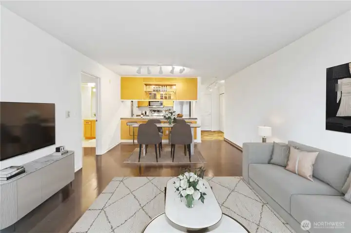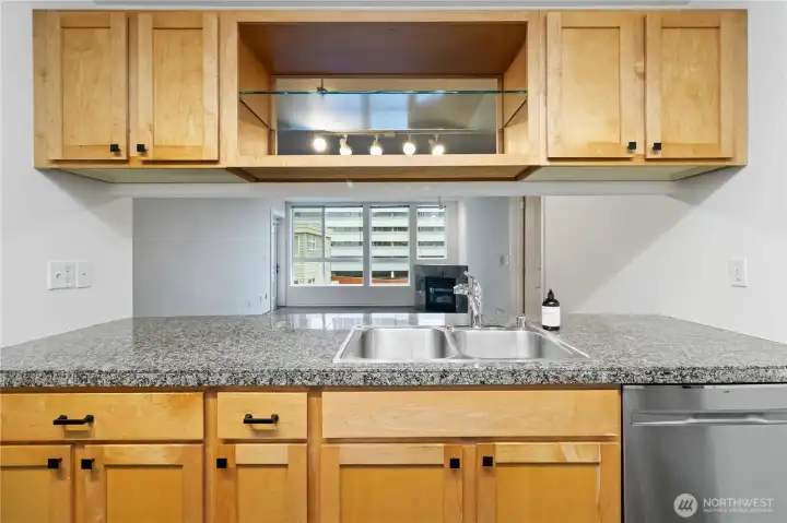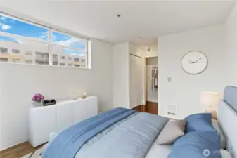 Wake to soft morning light pouring through oversized windows in this 1,100-square-foot, freshly painted two-bedroom, two-bath, top floor residence in the heart of downtown Bellevue. High ceilings and an open layout create an airy backdrop for everyday living—morning coffee by the gas fireplace, evenings spent unwinding on the deck just off the living room. The kitchen blends style and function with stainless steel appliances, granite countertops, and a conveniently located in-unit washer and dryer. The primary suite offers a private retreat with its own deck, while the second bedroom flexes easily as a guest room or home office. Enjoy controlled garage access with assigned parking, elevators, and trash chutes. Just outside, parks, dining, museums, and shops await, with easy access to I-405 for seamless city living.