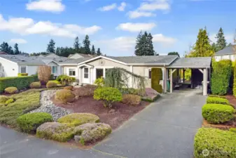 Beautiful and very well maintained manufactured home conveniently located in Mountain Greens. Offering 1,188 square feet of living space featuring 3 bedrooms & 2 bathrooms, living room, dining room, kitchen & laundry room. Soaring vaulted ceilings & lots of windows make this home feel spacious, bright and comfortable. Blind and curtains/drapes throughout home. All appliances stay. park-like, low maintenance front and rear landscaping. Large back patio with attached and detached storage. Attached carport with additional driveway parking. Modest space rent of $1102.00 per month (buyer to acquire park approval). Shopping, dining and more located just steps away from the park. Easy access to JBLM, shopping, freeway & more. Buyer/buyer's agent to verify all information to own satisfaction.