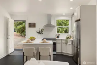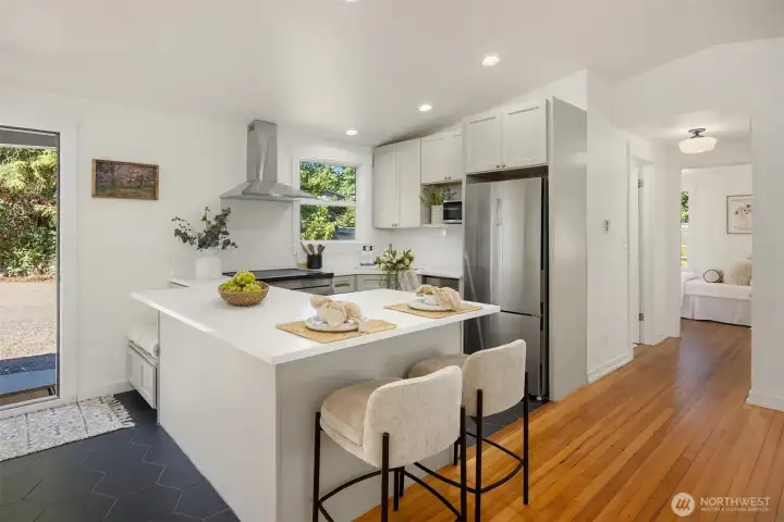 Remodeled and radiating charm, this single-story end-unit condo captures the best of Bainbridge Island living, blending historic character with modern comfort. Originally built in 1942 as an officer’s barracks, the home has been thoughtfully updated while preserving its timeless appeal.Inside, vaulted ceilings and original fir floors create warmth and character, complemented by abundant natural light. The fully renovated kitchen features sleek finishes, all-new appliances, and a dishwasher—perfect for both daily living and entertaining. Two comfortable bedrooms provide peaceful retreats, while a versatile bonus room offers flexibility as a home office, dining area, or flex space to suit your lifestyle.Enjoy seamless indoor-outdoor living with private spaces designed for relaxation. Start your mornings or unwind in the evenings on the covered porch, and take advantage of the fenced yard—ideal for pets, play, or gardening. As an end unit, the home offers added privacy along with the convenience of both front and back entrances.Located just minutes from trails, beaches, and the shops and restaurants of Lynwood Center, this home offers easy access to everything that makes Bainbridge Island so special. A unique blend of history, charm, and location—this is Bainbridge living at its finest.