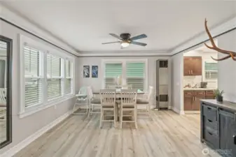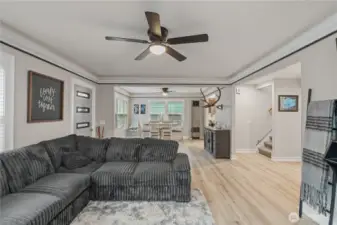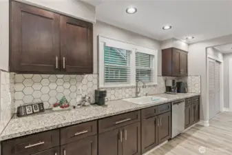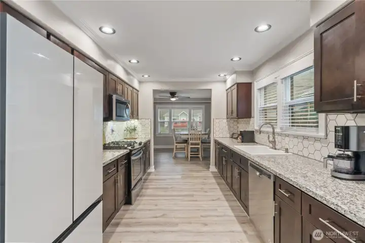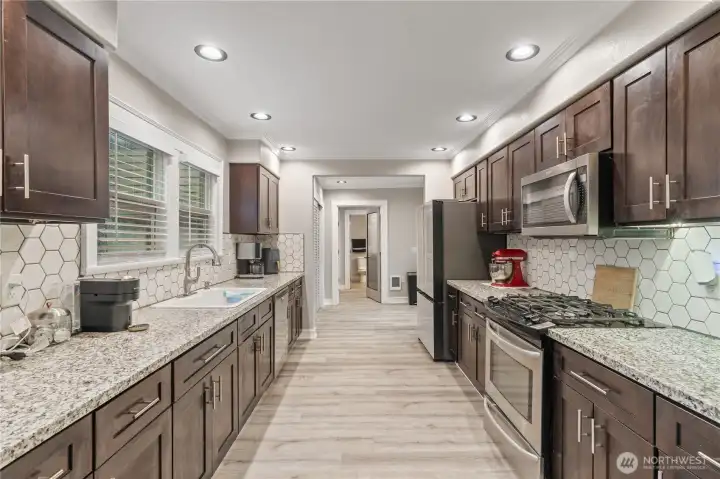 On Cherry St in Hoquiam, this home suits buyers looking for a central location paired with spaces that connect easily indoors and out. The first impression is the open flow between the living room, dining area, and kitchen, creating a layout that feels cohesive and practical. Granite countertops and well-appointed appliances anchor the kitchen, while new flooring, LED lighting in the living room, updated light fixtures, and ceiling fans contribute to a clean, refreshed feel throughout the main living areas. A main-level bedroom adds flexibility, and the connection continues outdoors to the covered deck with a custom bar, fire pit, koi pond, and backyard space that extends everyday living outside. With three bedrooms and 2.5 bathrooms, the layout remains flexible without feeling oversized. Added closet and storage space in the primary bedroom improves everyday organization, while the updated walk-in shower in the back bathroom reflects improvements chosen for function. Additional features include a fully fenced front and back yard, sprinkler system, landscaped grounds with new grass seed, RV parking, and a renovated garage. Centrally located between grocery stores, schools, and the YMCA, the home supports an efficient, well-connected routine.