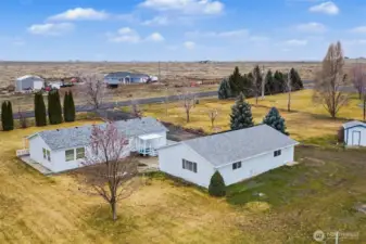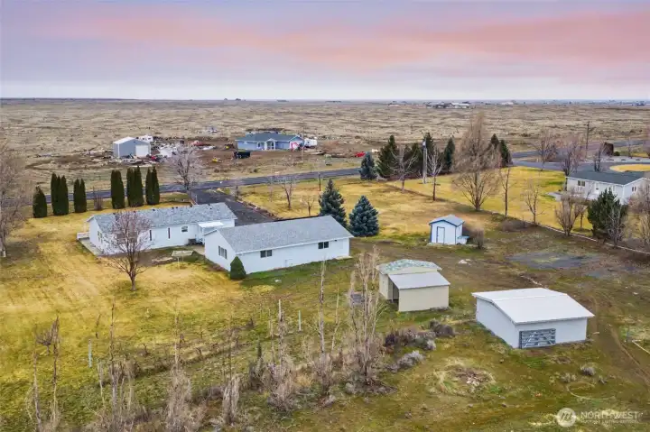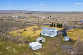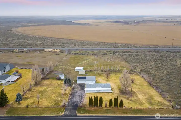 This irrigated mini-farm is a five-acre homestead located just minutes from Soap Lake and Stratford. The property features pastures, a small orchard, grape vines, garden beds, and a comprehensive irrigation system that includes lines and sprinklers. Additional amenities include a 1,440-square-foot shop equipped with a half bath and recreation room, an integrated solar panel system with net metering, several outbuildings, and well irrigation water for the property. The house boasts a new roof and fresh exterior paint. Inside, there are three bedrooms and two bathrooms, including a primary suite with a private bath and walk-in closet. The home has been professionally cleaned and is ready for you to add your personal touches to reach its full potential. All kitchen and laundry appliances are included.