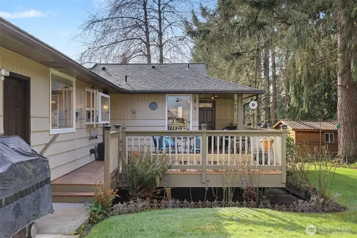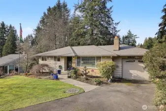 Inviting rambler in the Kenmore/Northshore area offering an easy, welcoming flow and clear pride of ownership throughout. The living room is anchored by a cozy fireplace, with hardwood floors extending through much of the home. The spacious kitchen features generous counter space and a large in-kitchen eating area, ideal for everyday living and gathering, with a convenient laundry room just off the kitchen. Tucked away for privacy, the primary suite addition functions as a true owner’s retreat with a walk-in closet, soaking tub, walk-in shower, and private access to a covered porch and large Trex deck. Step outside to a fully fenced backyard with mature landscaping, lawn irrigation, and a storage shed, offering space to relax or entertain. Extensive improvements over time include an updated roof, updated kitchen and baths, vinyl thermopane windows, Leaf Guard gutters, and 6-panel wood interior doors. Major system updates include updated electrical and plumbing, gas forced-air heat with heat pump and air conditioning, an updated furnace, and improved attic and crawlspace insulation with moisture control. Located in the Northshore School District. Thoughtfully maintained with a layout that supports comfortable everyday living, indoor-outdoor connection, and flexible entertaining spaces. Private setting set back from the road, offering a quiet feel with easy access to parks, trails, shopping, and commuter routes.