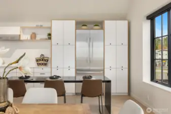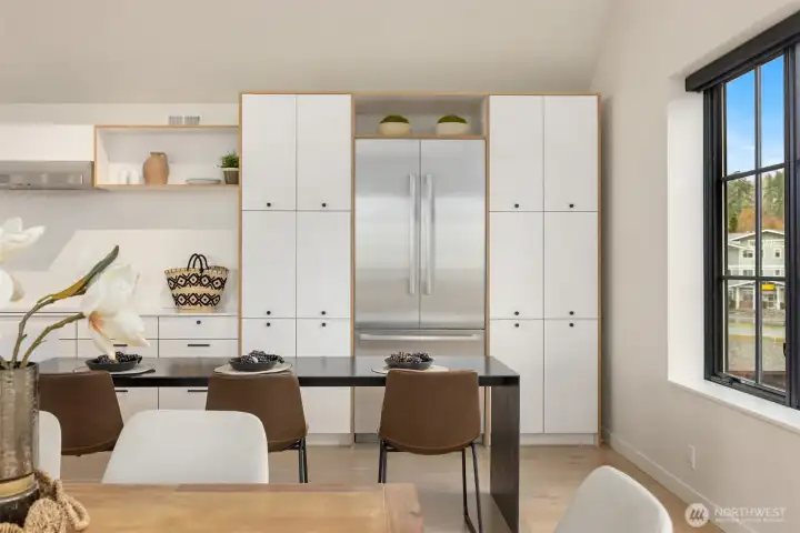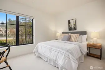Positioned to capture the best views in the development, this exceptional south-facing, end-unit townhome is a refined expression of modern coastal luxury. Spanning three light-filled levels and serviced by a private elevator, the residence balances architectural sophistication with effortless comfort. Concrete entry and flexible commercial space (available separately) anchor the main level, while open wood stairs invite you upward. The second floor is a serene retreat, showcasing a sumptuous primary suite with a spa-inspired bath featuring designer tile, heated floors, a wet room with deep soaking tub, floating double vanity with quartz counters, and a private toilet closet. Two additional bedrooms, a beautifully appointed full bath, and a thoughtfully designed laundry room complete the second floor. Crowning the home, the vaulted third floor unfolds into an entertainer’s dream with an open kitchen, living, and dining space framed by spectacular water views. A 14-plus-foot quartz-topped island with waterfall edge, Bosch stainless appliances, bar area, and ample cabinetry elevate everyday living, while Pella doors open to a covered deck with fire pit and concrete, wood, and steel accents—perfect for sunset gatherings! Set in vibrant Lynwood Center near shops, dining, the historic Lynwood Theater, and miles of trails and water access at Fort Ward, this is understated luxury at its most captivating.