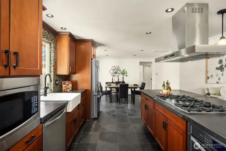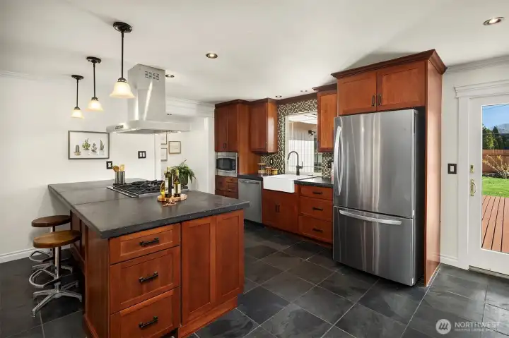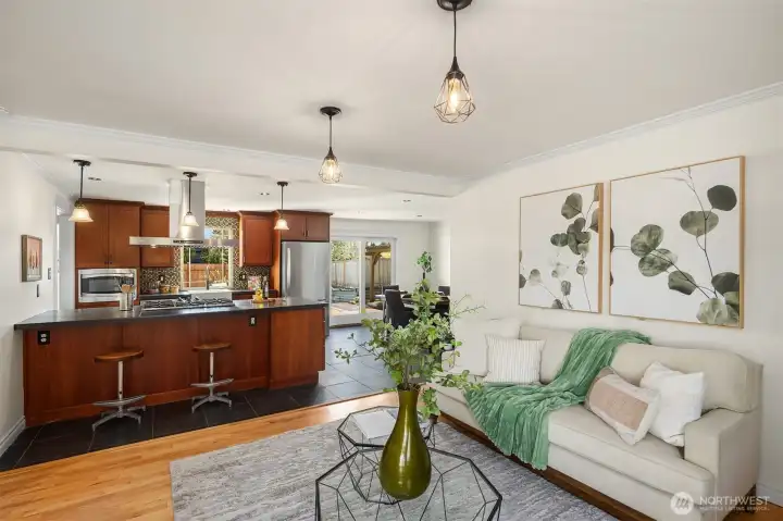 Wonderfully located rambler with RV parking offering 4 beds, 2 baths across 1840 sg ft with convenient access to Seattle, Bellevue, Redmond & SeaTac Airport. This move-in ready home features new interior paint, new carpet, and refinished hardwood floors. The expansive kitchen offers abundant cabinet and countertop space, anchored by an industrial-style stove and statement extraction hood as a central design feature. The central kitchen and living spaces are flanked by 3 bedrooms and a full bath on one side, and a primary bedroom with adjacent 3/4 bath with double vanities on the other. The large bonus room with skylights and bay window overlooking the yard offers exceptional flexibility for a home office, media room, game room, gym, or more. Enjoy seamless indoor-outdoor living with oversized deck accessible from both the dining area & bonus room. The large fully fenced yard is ideal for play, gardening, or outdoor entertaining. Shaded patio area creates a natural gathering space, with additional barked area ready for a playset, trampoline, or future garden expansion. Gated RV parking pad with direct access to Union Ave. Spacious laundry room with utility sink, and 2020 furnace and newer heat pump providing worry free heating and air conditioning. Easy access to major employment centers, shopping, dining, parks, and SeaTac Airport. New roof will be installed at no expense to buyer prior to closing. Lot may be suitable for Renton's Permit Ready ADU program - buyer to verify.