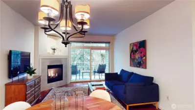 Set against a protected greenbelt, this well-maintained and thoughtfully updated ground-floor condo offers privacy, comfort, and convenience in one of the area’s most accessible locations. With peaceful wetlands directly behind the unit, the home enjoys a quiet, natural backdrop that can be appreciated from both the interior living spaces and the covered patio. Inside, hardwood floors define the main living areas, complemented by carpet in the bedrooms. The living room features a cozy, temperature-controlled gas fireplace—ideal for creating warmth and ambiance while maintaining energy efficiency. Large windows bring in natural light while preserving privacy. The kitchen is both functional and stylish, featuring stainless steel appliances, quartz countertops, and ample cabinetry. It opens easily to the dining and living areas, creating a layout well-suited for everyday living as well as entertaining. The primary suite was updated in 2024 and offers a comfortable, refreshed retreat. The bedroom includes a walk-in closet plus a second closet, providing excellent storage. The attached primary bathroom features an elevated dual-sink quartzite vanity with generous counter space and a walk-in shower with excellent water pressure. Ground-floor access and wheelchair-friendly features add to the home’s practicality and long-term livability. The covered patio includes additional storage and offers a private outdoor space.