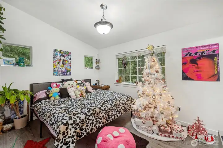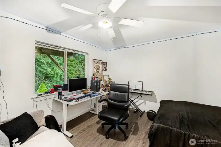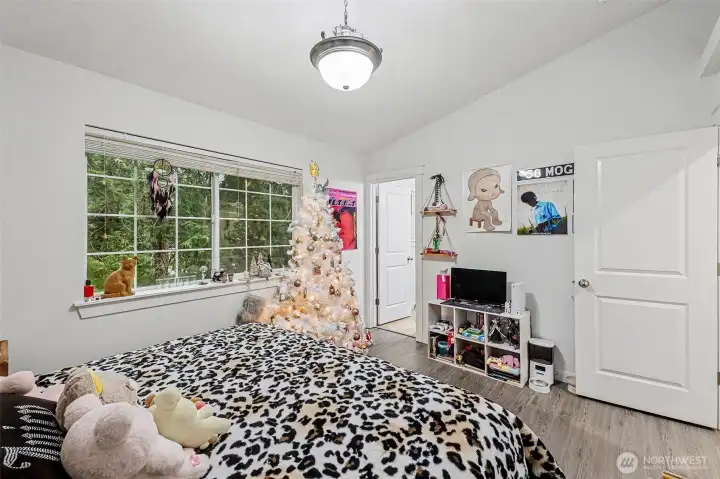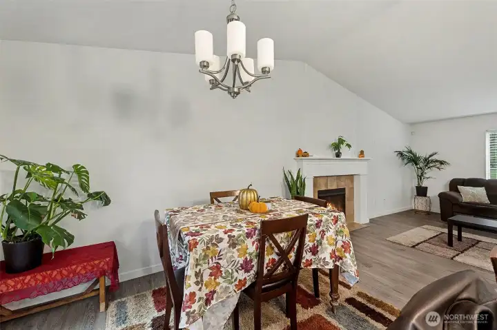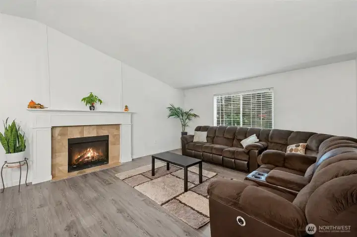 An amazing buyer's bonus from seller (Credit of $5,000 for new kitchen appliances. Or use that to apply it to your closing cost.) Tucked away at the end of a quiet cul-de-sac and surrounded by trees, this peaceful home offers comfort and privacy. Laminate floors and vaulted ceilings enhance the bright, open living spaces. The living room features a gas fireplace with a charming shiplap mantle, while the dining room opens directly onto the deckâperfect for indoor-outdoor living. The kitchen boasts new, rich cabinetry and a center island. The primary suite includes a full ensuite bath and a walk-in closet with an extensive closet system. Gas hot water and fireplace add efficiency and comfort. Low maintenance and move-in ready, the home also offers a grassy backyard with a path leading into the woods. Enjoy true tranquility and privacy next to acres of forest.