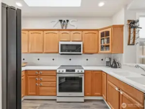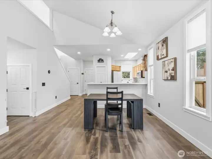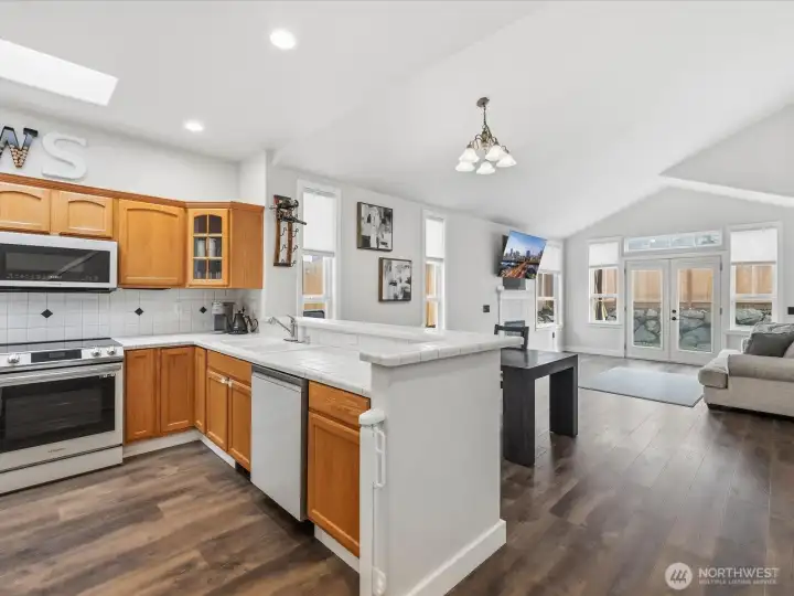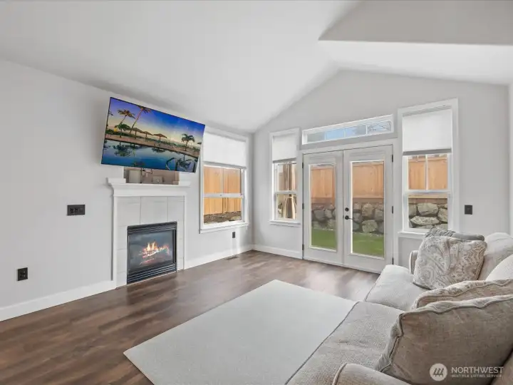 Light-filled open concept Edmonds townhome w/ soaring ceilings, cozy gas fireplace, & LVP floating floors spilling throughout the main. French doors open to a fully fenced, private outdoor oasis, w/ astroturf, & an oversized patio rarely found in townhome living. Primary bedroom on the main offers a walk-in closet w/ built-ins, & a spacious ensuite bathroom. Kitchen includes a pantry, like new appliances, tons of counter/cabinet space, & breakfast bar. Many upgrades including custom window treatments, w/ blackout curtains, landscaping, paint, furnace & AC heat pump. All this, & abundant storage, 2-car garage in a small, well-maintained community w/ HOA-managed front lawns. Lives like a single-family home w/ the ease of low-maintenance living. Commuters Dream - less than 3 miles from Light Rail!