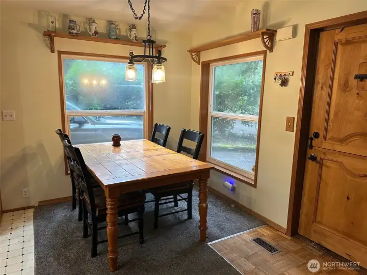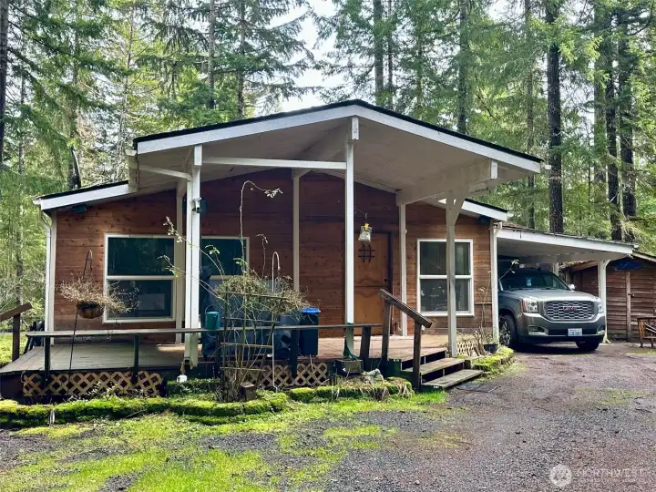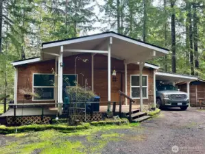 Opportunity knocks with this affordable full-time home or recreational getaway! This home needs a little TLC but is priced accordingly. Modern two bedroom, two bath home in Lake Cushman's popular Mount Rose Village. You are greeted by a covered deck and enter into a cozy vaulted living room complete with a free-standing propane fireplace. A full equipped oak kitchen w/eating counter features abundant cabinetry, skylight, wall oven and modern appliances. Vaulted primary bedroom with double sinks, shower, and walk-in closet. A spacious single car garage is attached and accessed via the utility room (washer and Dryer included) plus carport for an additional covered stall. Backing on a greenbelt there is a private yard complete with firepit. Bring a paintbrush and ladder and you will have instant equity! Offered as-is. Nearby recreational opportunities include boating, fishing, kayaking, golf & tennis. Wal to the lake or hike in nearby Olympic National Park. A perfect getaway for your year round adventures with short stay rental potential!