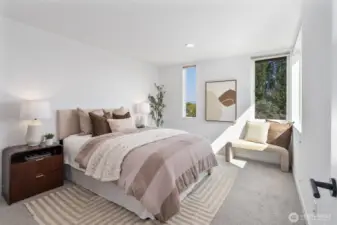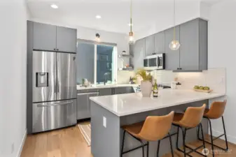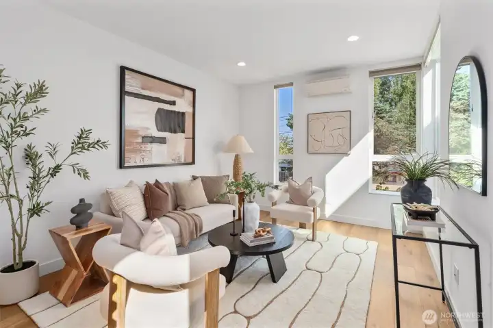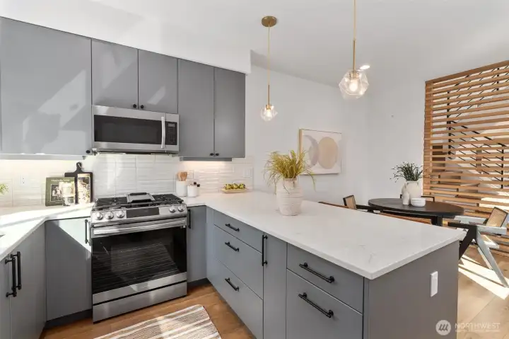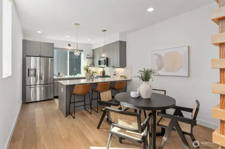 Experience a beautifully crafted modern home showcasing a sleek design. The kitchen is equipped with stainless steel appliances, a gas cooktop, and elegant quartz countertops, complemented by a convenient breakfast bar.The living room boasts a spacious layout with ample room for relaxation, accentuated by the wide-plank hardwood floors and stunning views through the large windows flooding the space with natural light. Two dedicated office/den spaces offer versatile areas for work or relaxation, while the bedrooms provide serene retreats. The rooftop deck, provides a stunning outdoor retreat while you enjoy a deeded parking space and situated in the heart of Wallingford, close to Gas Works Park, Fremont, Green Lake, & the Burke-Gilman Trail.