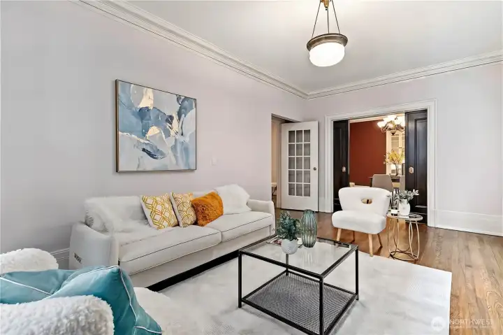 The Old Colony was built in 1909 as a luxury residence in the manner of fashionable East Coast apartments of that era. Unit 27 features 1,112 square feet of living space, soaring 9-ft ceilings with architectural millwork, 14” baseboards, gorgeous oak hardwood floors, original mahogany pocket doors, and updated double paned windows. Timeless elegance is complemented by a the beautifully remodeled kitchen with gas stove and bathroom with radiant floor. Perfect for entertaining, the kitchen opens to a grand dining room and living room. There is plentiful storage throughout the unit as well a secure dedicated storage space in the building's basement. Private and quiet, overlooking the courtyard, the unit has a large primary and a second bedroom with integrated Murphy Bed which is easily converted from home office to guest room. Conveniently located to restaurants, theaters, museums, shops, private & public schools and all of First Hill's hospitals and clinics. Easy access to Capitol Hill, Downtown, The International District, and transit. Pet friendly, no rental cap. Each floor has a rarely used dedicated laundry room, this one is steps from unit. Many have added in unit laundry with Board approval. Multiple parking garage options available nearby as well as Zone 7 parking permit. HODs include water, sewer, garbage, and internet. This condo lives like a stately home from Seattle's rich and storied past.