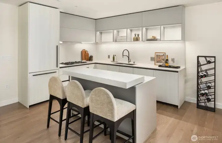 This brand new residence is defined by breathtaking water views and a sense of quiet luxury inside. The expansive primary bedroom commands panoramic views of Lake Washington and the Seattle skyline, while the secondary bedroom is well appointed to serve as a study or guest bedroom. Impeccable design details are included throughout, from Italian-made Ernestomeda cabinetry to German-engineered Gaggenau appliances. The home's interior has been decorated by designer Tara Nelson, inspired by Liquene Dreams. Experience elevated living with 24-hour concierge service and a sophisticated first-floor lobby that sets a tone of refined elegance. Residents enjoy a private, fully equipped fitness center with dedicated yoga studio, a second-floor residential lounge with full kitchen and flexible entertaining space, and a beautifully designed outdoor terrace featuring firepits and a gas grill—perfect for gatherings under the stars. Thoughtfully curated amenities also include a private Dog lounge, dog walk area and an indoor bathing station, ensuring every member of the household is cared for in style. Avenue Residences is perched above a dynamic plaza marked with a growing retail collection and the renowned InterContinental Seattle Bellevue. This award-winning lifestyle destination presents Seattle’s east side with a new expression of international flavor, style and luxury crafted for connoisseurs of life.
