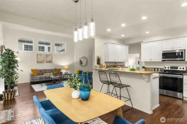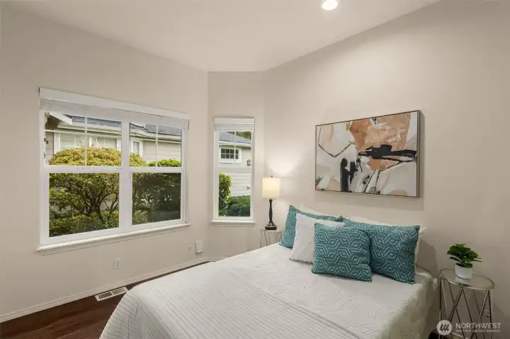 Stunning Redmond townhome in a prime central location. Light-filled open floor plan with only one shared wall offers exceptional privacy. Features include soaring ceilings in the living room, a modern kitchen with granite countertops, and a fully fenced backyard ideal for entertaining. Main-level room functions as a bedroom or den. Upstairs primary suite boasts vaulted ceilings and a luxurious five-piece bath, plus a spacious guest suite. Recent updates include fresh interior paint and new primary bath flooring. Minutes to Costco, Whole Foods, Microsoft, Google, and Nintendo. NO rental cap.