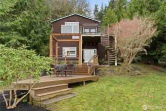 Located on a quiet, private street this enchanting waterfront home offers views that overlook the Hood Canal, Cascade Mountains, and Glacier Peak. Set on a tranquil and peaceful .65-acre lot with 75 feet of high-bank waterfront, this private retreat not only offers gorgeous water and mountain views, but also serenity with nature on display. This thoughtfully designed home offers a versatile floor plan with vaulted ceilings on both levels, refined millwork, and an abundance of natural light. As you enter this charming home, the entry level includes a very large spacious bedroom with deck access, 3/4 bath, laundry area, attached oversized 2 car garage and even a convenient dog wash station for your pet to enjoy a spa day! Upstairs is an open-concept living, dining, and kitchen space, and a second bedroom suite with full bath complete with large, deep soaking tub. Enjoy year-round comfort with a heat pump providing efficient heating and cooling air conditioning. Plenty of space to park your boat and RV parking with water and power hookups perfect for visiting guests. Three expansive view decks—perfect for entertaining, relaxing, or simply soaking in the ever-changing waterfront scenery. With no HOA or CC&Rs, this property offers outstanding flexibility - ideal as a full-time cozy residence, weekend getaway retreat, or an income-generating vacation rental. Just minutes away from dining, an 18-hole golf course, scenic hiking trails, and the resort marina.