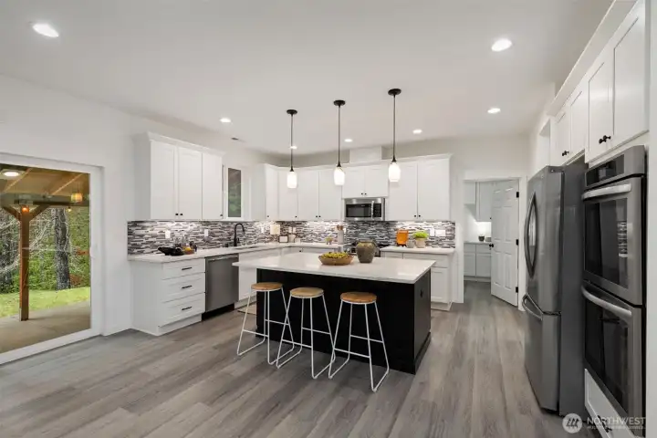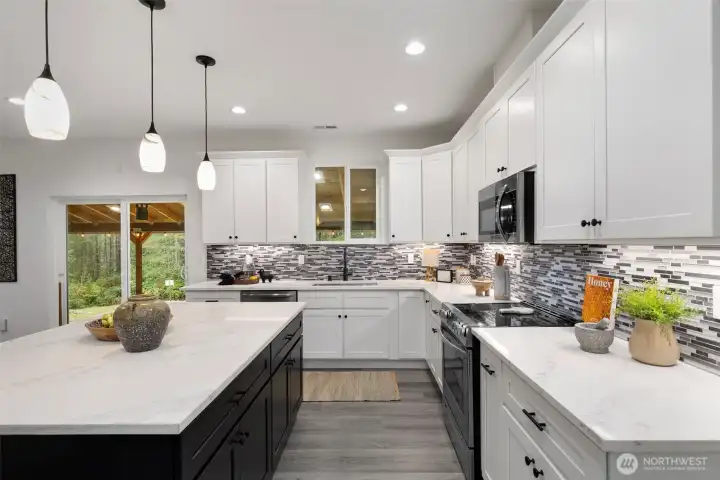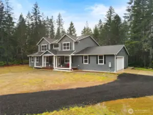 Custom-built in 2023, this stunning home sits on 5 private acres and blends NW Contemporary design with timeless comfort. The open-concept kitchen and living room feature a cozy wood-burning fireplace and seamless flow for everyday living and entertaining. A true chef’s kitchen offers quartz countertops, a large island, and three ovens—perfect for hosting and holiday gatherings. The main floor features durable LVP flooring throughout, a spacious primary suite, plus a second main-level bedroom with its own ensuite bath. A formal dining room adds flexibility for entertaining or special occasions. Upstairs, a generous rec room is plumbed for a wet bar, creating the ideal space for movie nights or game days. There are two additional guest bedrooms and a full bath upstairs. Step outside to the oversized covered back porch and relax in the hot tub while enjoying the peaceful acreage. Additional highlights include a 2-car garage with extra storage, space for a future shop, and permanent trim lights for holiday decorating ease! A whole-house Generac generator is also included. A rare opportunity to own a nearly new custom home with room to breathe.