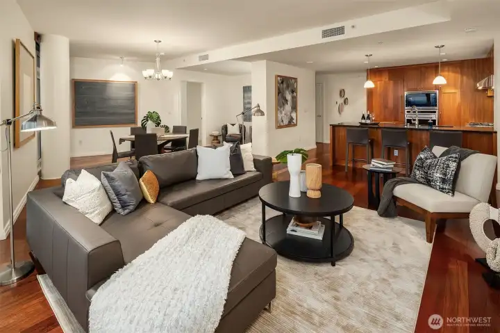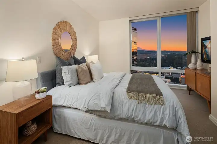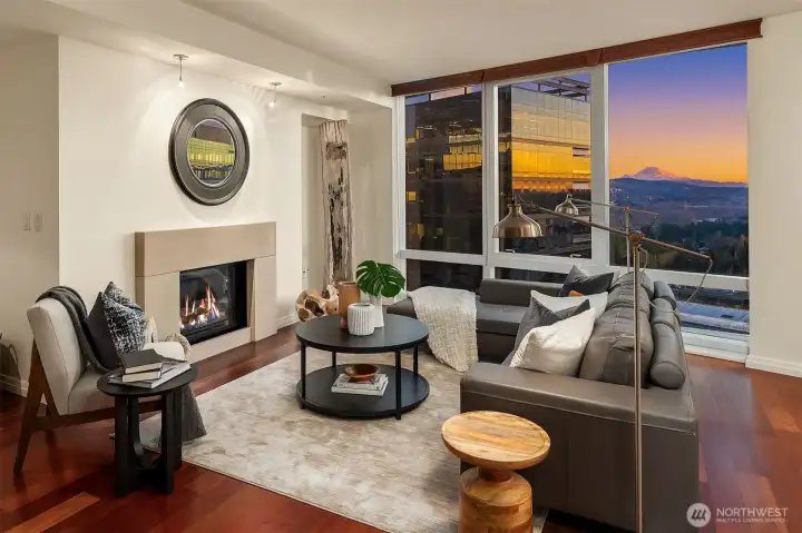 Don’t miss this sunny south-facing 2-bedroom residence at Bellevue Towers offering sweeping views Mt. Rainier, downtown Bellevue and Lake Washington views with an open layout perfect for everyday living and entertaining alike. Highlights of the home include a spacious living/dining area with gas fireplace, kitchen with cherry cabinetry, slab granite countertops and Subzero/Wolf/Bosch appliances, home office, 9' ceilings plus a large balcony with gas for grilling. 2 large parking spaces plus oversized storage unit are also included. LEED Gold certified Bellevue Towers offers recently remodeled amenity spaces including fitness rooms, whirlpool spa with sauna and steam room, dining room with kitchen, community room, theater, game room, outdoor terraces, 1/2 acre park, concierge and all the best of downtown: shopping, dining, the Downtown Park and more all at your doorstep.