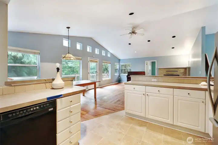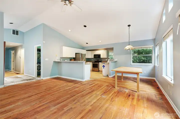 One-level living in North Beach! Just blocks from Cafe Fiore, Sunny Hill Pizza and Golden Gardens park, this home is ready for a refresh and the energy of new ownership. There are many elements of newer construction in place, as the home was renovated and expanded in 1995 (from the original 1929 structure), and the next owner has an opportunity to reimagine the fixtures, finishes and landscape plan. The interior features a great room concept with vaulted ceilings over the living, dining and kitchen areas. Looking west over a natural green belt, large windows let the light stream in. Four bedrooms include a flexible space that could be used as an office or bonus room. The primary suite is large enough for a king-size bed. An unfinished outside-entry basement holds water heater, furnace and offers additional storage. Detached one-car garage with electricity and a surplus of off-street parking in the long driveway. An expansive lot offers interesting possibilities. Buyer to verify whether the lot is suitable for a DADU build or other construction. This quality north Seattle neighborhood is a great place to call home!