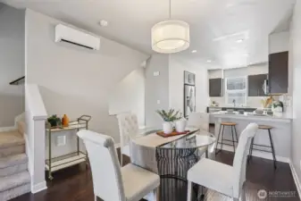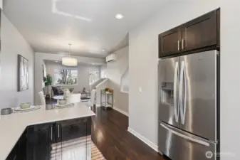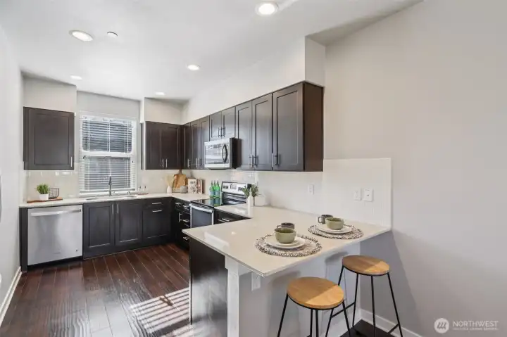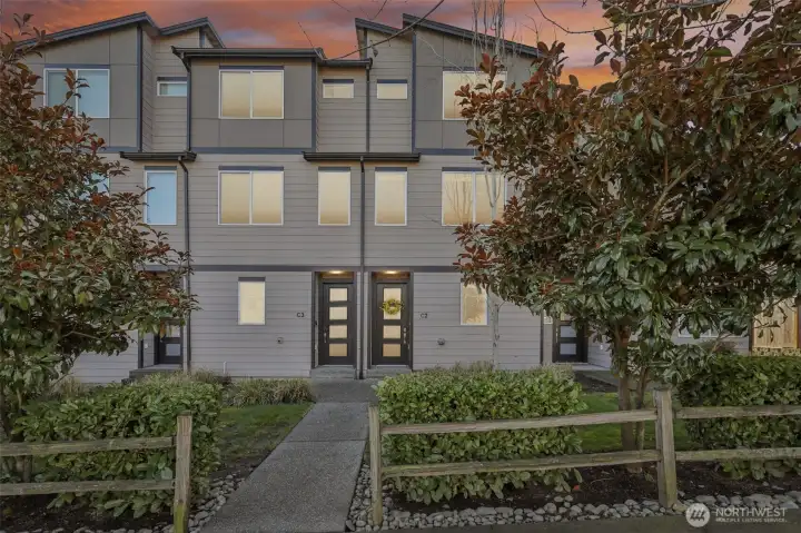 Modern, move-in-ready townhome in a sought-after Lynnwood location. Built in 2018 and meticulously maintained, this 2-bedroom, 2.5-bath home features an open-concept main level with quartz countertops, soft-close kitchen cabinetry, and a cozy fireplace anchoring the living room. Fresh interior paint in the living and kitchen areas, along with professionally cleaned carpet, add to the home’s turnkey feel. A main-floor mini-split offers efficient heating and cooling year-round. Both bedrooms include private ensuite bathrooms, with the primary suite showcasing dual sinks for added comfort. The two-car tandem garage fits two vehicles and offers extra storage space. This single-owner home boasts low HOA dues, no rental cap, and the remaining builder warranty transfers to the buyer—providing peace of mind and long-term value. Ideally located near shopping, dining, and the light rail station, with quick access to I-5 and I-405. A rare opportunity to enjoy modern design, comfort, and convenience in an exceptional location.