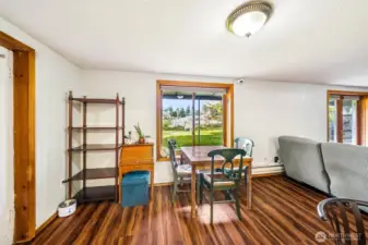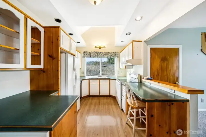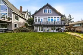 Rare opportunity on Enchanted Island at Spanaway Lake, first time on the market! Travel over an idyllic 1 lane bridge and arrive at the island - 26 homes nestled in a park like setting, large maintained greenbelt & sports court at the center encircled with parking & lighting. Beautiful landscaping tucks this home into its own tranquil world, including 50 ft of lake frontage offering a PRIME spot on the lake, a quiet corner basking in sunshine all summer long. Enjoy your terraced landscaped backyard with personal dock. This home has been lovingly maintained and is ready for your vision! Main floor features 2 bedrooms, 1 bath and outstanding lake views! 2nd floor is approximately 600 sq/ft semi-finished, ready for a custom primary with en suite. Daylight basement is a studio apartment complete with full kitchen, bath and laundry - separately metered. Peaceful, fully fenced & usable front yard with mature landscaping. Hardwoods under carpet, attached 1 car garage, vaulted ceilings, there's too much to list! Opportunities on enchanted island are few and far between, act now!