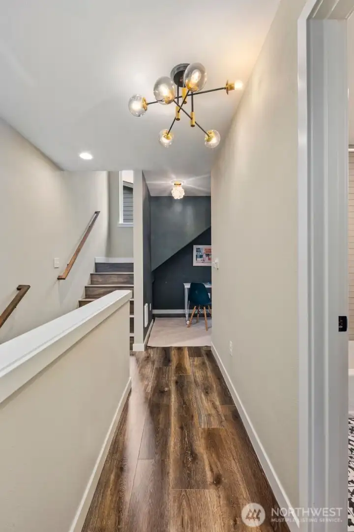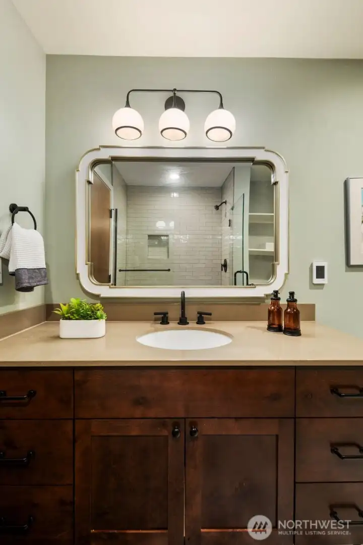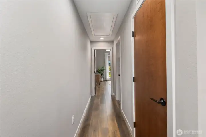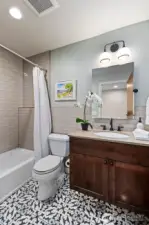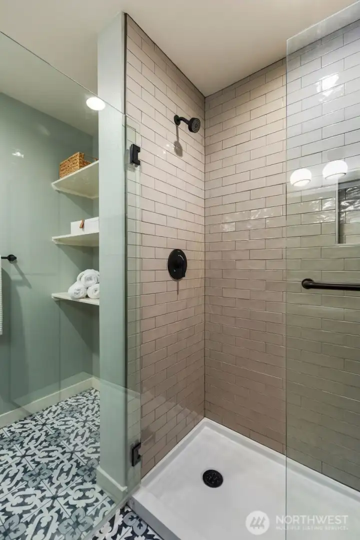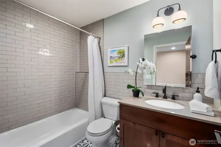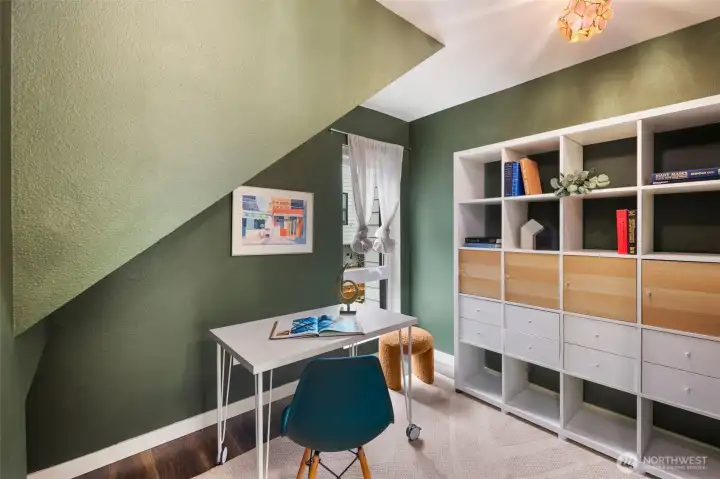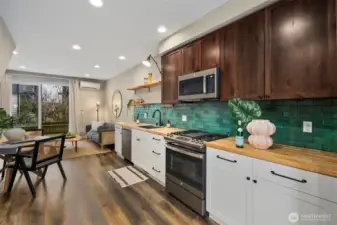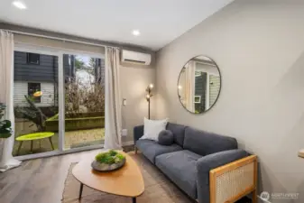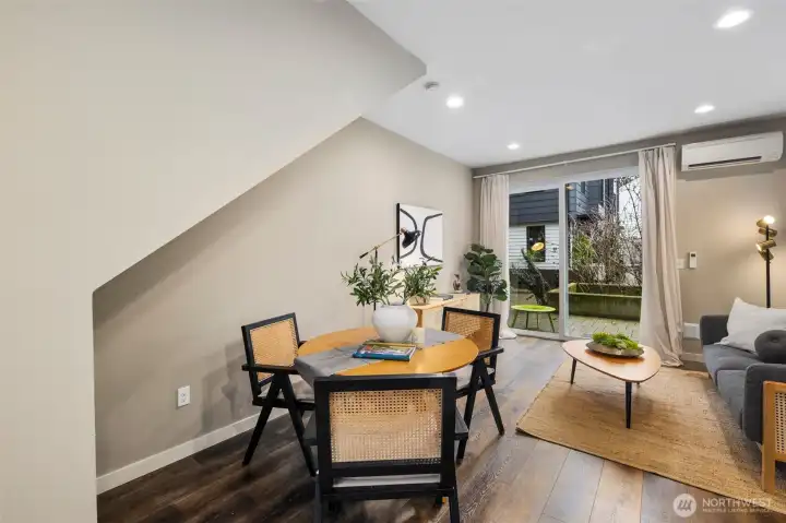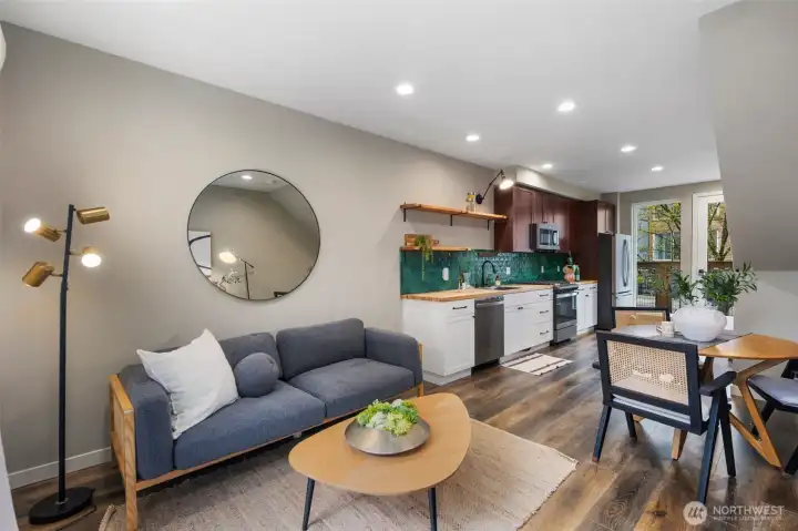 Embrace the vibrant energy of Greenwood in this modern, light-filled home. This distinctive home offers 2 bedrooms, a versatile den/office, and 2 baths, thoughtfully designed for both comfort and functionality. Vaulted ceilings, a heated floor in the primary bath, expansive attic storage, and an efficient layout elevate everyday living. The kitchen features beautiful butcher block countertops, a gas range, and high-end appliances. Oversized floor-to-ceiling windows on every level flood the home with natural light, while mini-split systems provide efficient heating and A/C year-round. On clear days, wake up to partial mountain views from the primary bedroom. Enjoy the community courtyard and dog run, plus easy access to Carkeek Park, Green Lake, local cafés, Northgate Light Rail, and downtown Seattle.