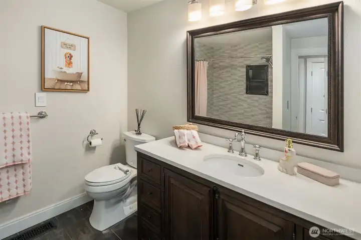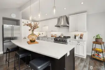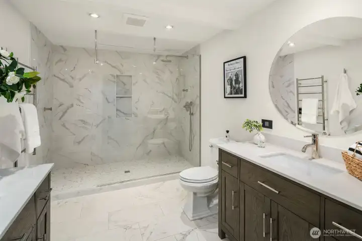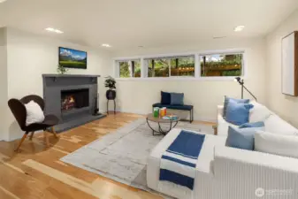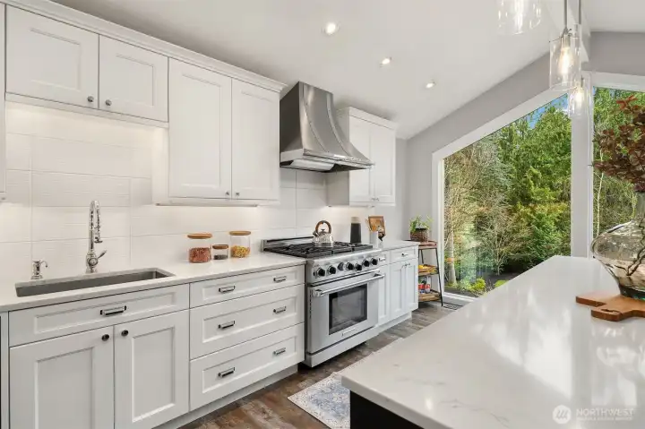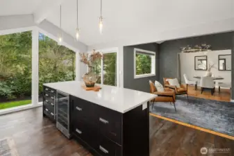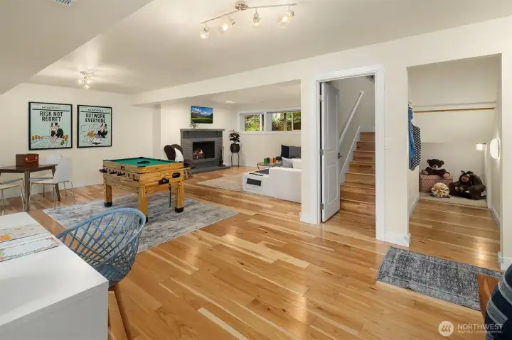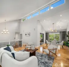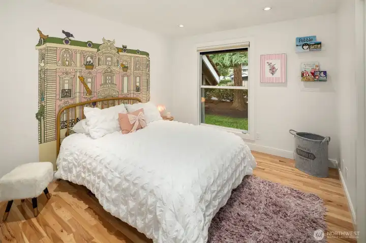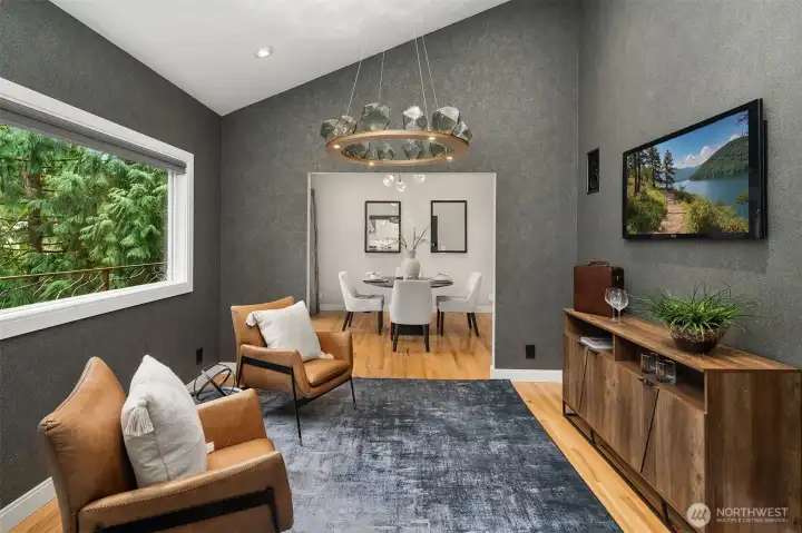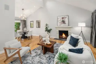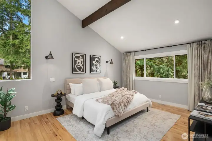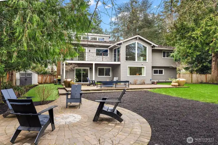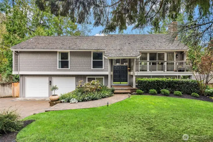 Contemporary flair + stunning updates in this stylish Bridle Trails remodel. Light & bright interior welcomes you with vaulted ceilings & generous rooms sizes, designed for entertaining. Extensive hardwoods throughout. Fabulous, renovated kitchen (2017) has new cabinetry, quartz counters & high-end appliance package. Expansive island offers generous prep space & seating for four. Cozy sitting/family rm off kitchen opens to great room with soaring ceilings, clear-story windows, stately stone fireplace & generous dining area. Upstairs deck for outdoor dining with custom wrought iron railing. Remodeled primary suite has vaulted ceilings, elegant bath with oversized shower, heated floors & walk-in closet. Two additional bdrms & full bath completes the main level. Lower level offers sought-after flexibility: 4th Bdrm with adjacent 3/4 bath, oversized laundry room has abundant cabinetry. Expansive bonus/family rm with hardwoods, wood-burning fireplace & room for an office nook + game table. Level, fully fenced sunny backyard opens to the oversized cobblestone patios with multiple entertaining areas. Mature landscaping for privacy, large lawn, garden space & shed. Close to Cherry Crest Elem., shopping, dining & Tech companies. Close to freeways, Spring District & Light-Rail. Enjoy nearby parks & 28 miles of Bridle Trails State Park trails.