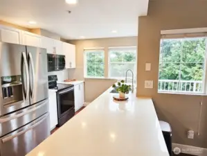 Rare opportunity in Sammamish Pointe community. This conveniently located condo boasts privacy, modern updates and abundance of natural light. No neighbors above and below, open-concept living area with high ceiling and gas fireplace, and large private balcony. Updated kitchen w/quartz countertops and a generous island - ideal for casual meals & entertaining. Large corner bedroom with thoughtfully updated walk-in closet. New engineered hardwood flooring thorough the unit. Top floor unit with a private single car garage below allows for additional storage space, plus guest parking nearby. Well-maintained HOA, covers water and sewer. Short distance to shopping, restaurants, hiking, and easy I-90 access. Pet-friendly community w/no rental cap.