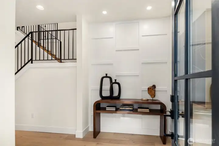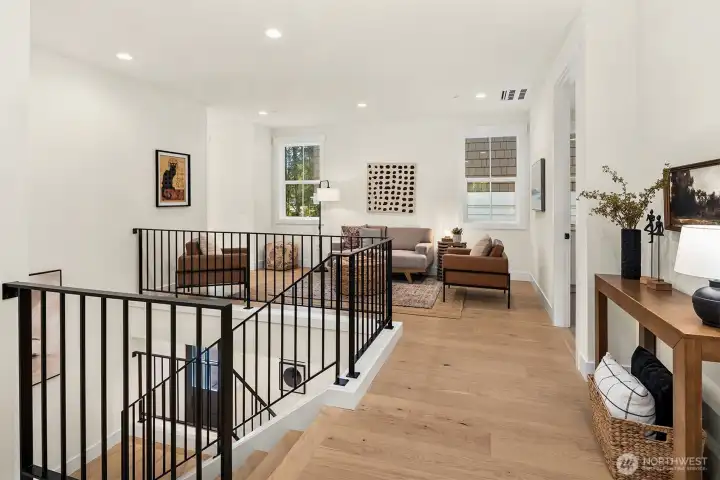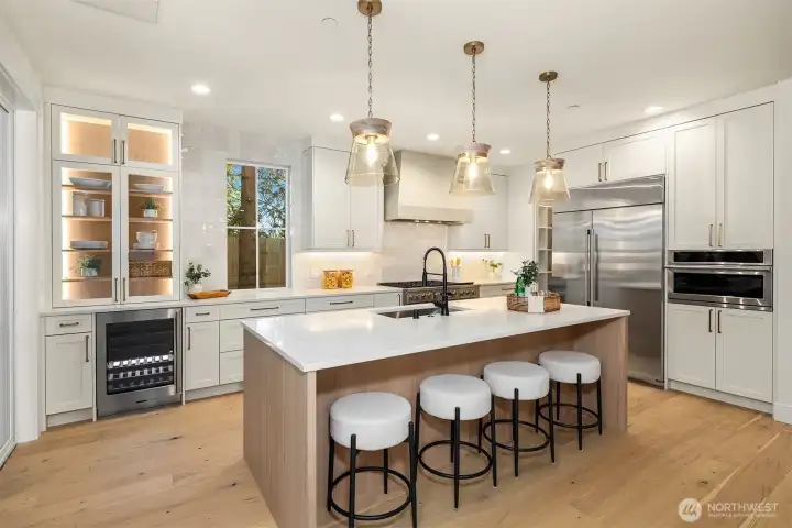 Tucked away in Kirkland's charming Highlands neighborhood is the stunning new home from renowned builders, A&R Homes. Enter into the great room with beautiful gas fire place, meticulously designed with custom surround and matching accent lights. Living area flows seamlessly into the chef's kitchen with space to gather around the oversized island. Custom plaster hood, beverage fridge and stunning Monogram appliances make it a joy to cook in this beautiful kitchen. Covered patio extends the living area outdoors any time of year. Dining area has a semi-private feel, but still accessible to the adjacent living spaces. Mudroom off two-car garage, powder room, and office complete this main level. Upstairs are four spacious bedrooms, three baths, a laundry room with built-ins and sink, and a bonus living area. The serene primary suite overlooks wooded surroundings and includes a spa-inspired bath with heated floors, soaking tub, luxe shower, and walk-in closet. Enjoy the Highlands lifestyle with tree-lined streets, nearby parks and trails, top-rated Lake Washington schools, and easy access to downtown Kirkland, waterfront dining, and major tech corridors.