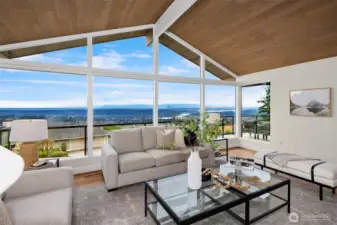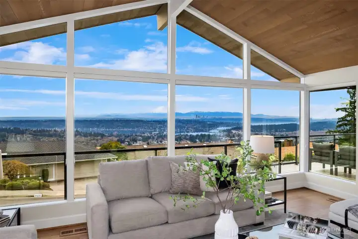 The view of a lifetime. This home greets you with vaulted ceilings opening to a wall of windows overlooking Somerset's signature lake, mountain, and skyline views, including Elliott Bay and Mount Baker. Beautiful views from nearly every room in the house - even the lower level. The updated kitchen, with high-end appliances (Sub-Zero, Wolf, Miele) and a large central island, adjoins the dining and sitting areas, creating a spacious yet comfortable great room. Decks at the front and back offer options for al fresco dining, relaxing in the sun or shade, and soaking in the views, day or night. Primary ensuite with updated bath, dual closets, and view deck. Expansive lower level with space to work, play, tinker or simply relax. This home offers so many great spaces, both inside and out. Meticulously maintained by the same owners for over 40 years, with regular upgrades and attention to detail. Incredible neighborhood with stellar schools, Somerset, Tyee, and Newport High. Easy access to downtown and tech hubs. Truly a home to love.
