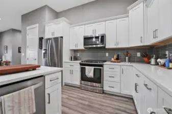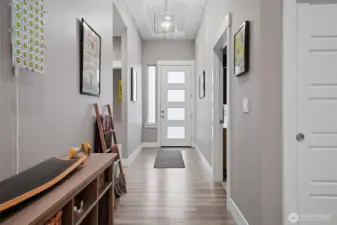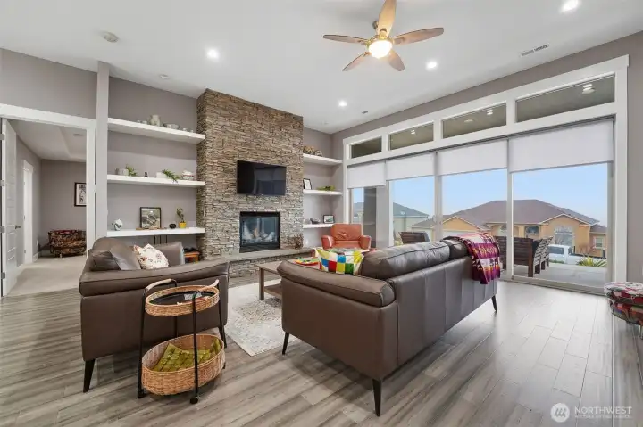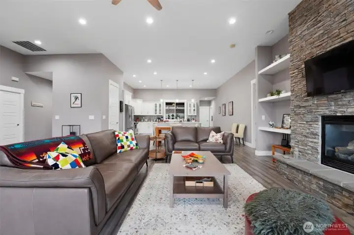 Beautiful contemporary home with front views and backyard privacy. The open floor plan features an island kitchen with white cabinets, quartz counters, and hardwood floors, plus a great room with a floor-to-ceiling rock fireplace that opens to a large covered patio. The split-bedroom layout includes a spacious primary suite with a walk-in mud-set shower, soaking tub, and double vanity, along with three additional bedrooms or two plus a den. A great laundry room and private back patio complete the home. Efficient central heating and cooling throughout