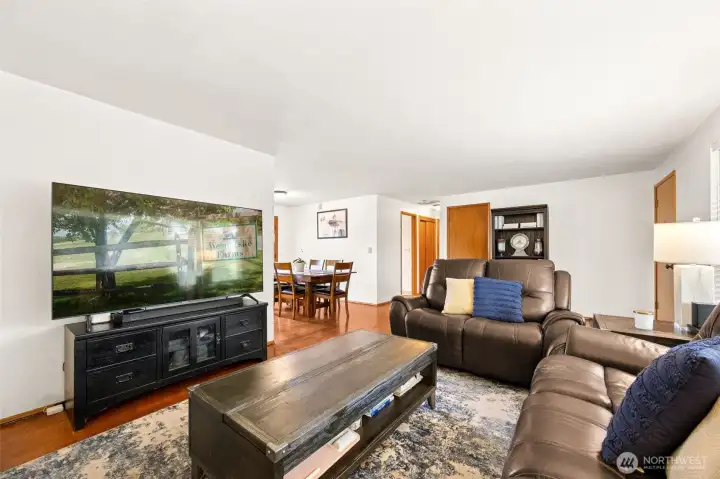 Well maintained 2-bedroom rambler with a 3-bedroom septic, offering flexibility for future expansion + NEW ROOF. The home features a spacious living area and a large dining room between the kitchen and family room, with double doors leading to the backyard patio for easy indoor-outdoor living. The family room features a warm brick hearth and cozy wood-burning fireplace, while air conditioning in this home keeps it comfortable during warmer summer months. The classic white galley kitchen is refreshed with granite countertops and a neutral subway tile backsplash with views into the backyard. The laundry room featuring a newer hot water heater, access to a walk-in pantry/storage area + exterior door leading to the backyard patio. The updated bathroom includes a tile-surround tub/shower combo, granite countertops, and modern lighting. Backyard is partially fenced and offers a firepit area, covered wood storage & small outbuilding that could be a chicken coop along with your very own grape vine, apple and cherry tree! All situated on a generous and fully fenced 11,000 sq ft lot with room to enjoy or expand.