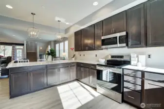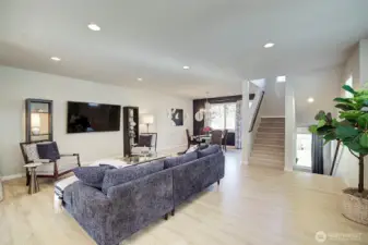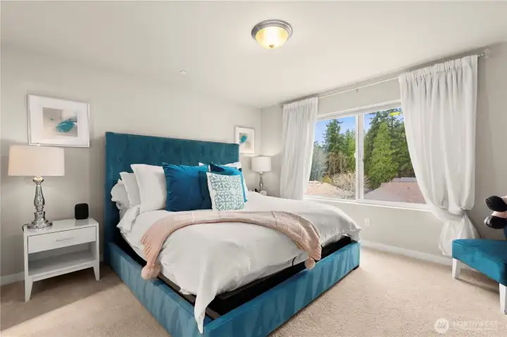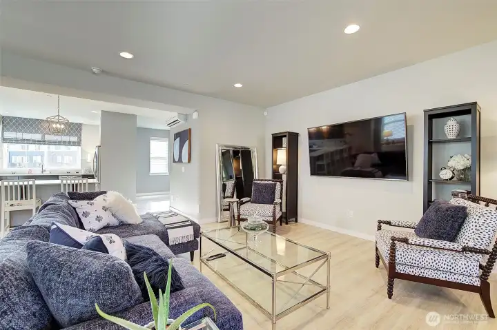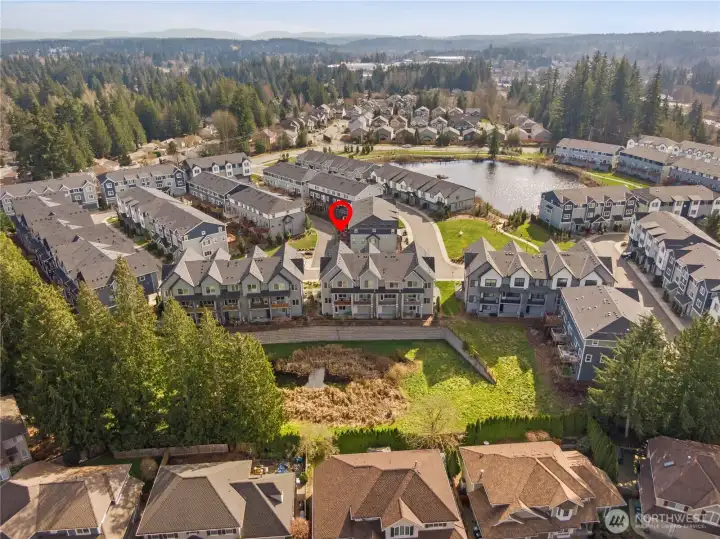 Welcome to this sun-drenched corner-unit townhome in the coveted Ponds community. Offering 4 bedrooms, 3.25 baths, and 2,539 sq ft of thoughtfully designed living space, this home delivers the comfort of a single-family residence with low-maintenance living. A welcoming foyer leads to a bedroom and full bath, ideal for guests or a home office. The open-concept main level features a chef-inspired kitchen with quartz countertops, stainless steel appliances, induction cooktop, pantry, and oversized island, flowing into the dining area and great room with serene pond and natural views. Engineered hardwood floors and abundant natural light enhance the inviting atmosphere. Upstairs, the primary suite is a peaceful retreat with tranquil views, complemented by three additional bedrooms. A heat-pump split A/C system provides year-round comfort. Enjoy outdoor living on the patio in this friendly community, just steps from the scenic pond and miles of walking trails. Located less than a mile from Mill Creek Town Center with easy access to shopping, dining, transit, top-rated schools, and I-5/I-405. Oversized two-car garage with EV charger, ample storage, plenty of guest parking, and NO rental cap—ideal as a primary residence or investment.