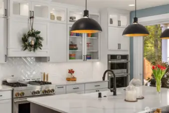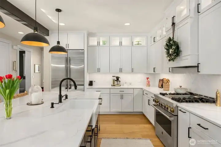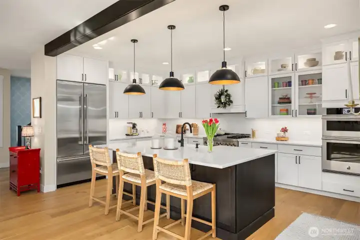 Thoughtfully designed with exquisite finishes, this light-filled home offers 4 bedrooms plus a built in home office space adjoining the great room and a spacious bonus loft. The luxe kitchen features top of the line appliances (Wolf range, Sub-Zero fridge), quartz counters, an attractive tile backsplash, an island with an undermount sink, walk-in pantry, soft-close cabinetry, and plentiful custom storage with built-in organizers. The great room is anchored by a handsome hearth and opens to the serene, private yard with striking professional landscaping courtesy of Susan Calhoun / Plantswoman Design. Overlooking the greenbelt, the covered back patio is perfect for everyday living and entertaining. Double doors open to a luxe primary suite with a large walk-in closet and spa-inspired ensuite featuring dual vanities, a tile walk-in shower, and a soaking tub. Three additional bedrooms and a versatile bonus area complete the layout. Stylish custom finishes shine throughout—shiplap, tasteful wallpaper, distinctive lighting, high ceilings, and numerous built-ins (do not miss the butler's pantry). The upstairs laundry room is so chic that you might fall in love with ironing. Heat pump with A/C, 8’ interior doors, and a 2-car garage with epoxy finish. Flawless details and exceptional style throughout. This one gets 4 gold stars.