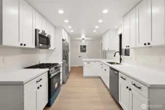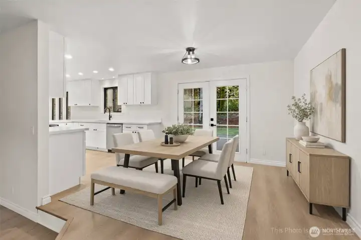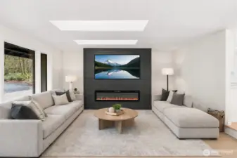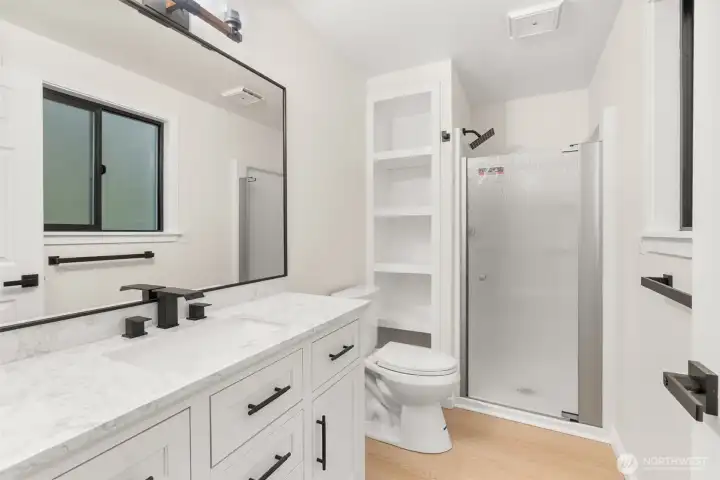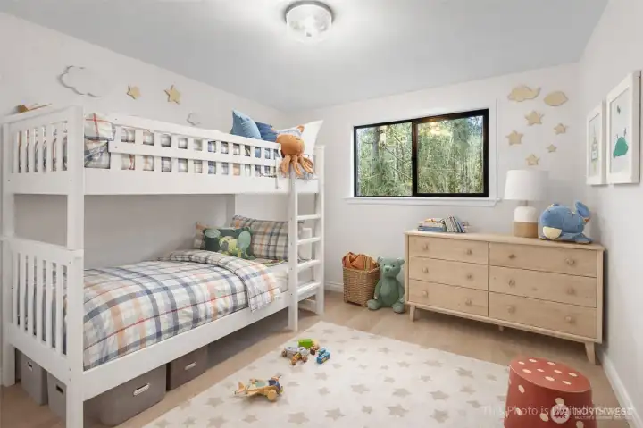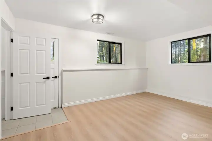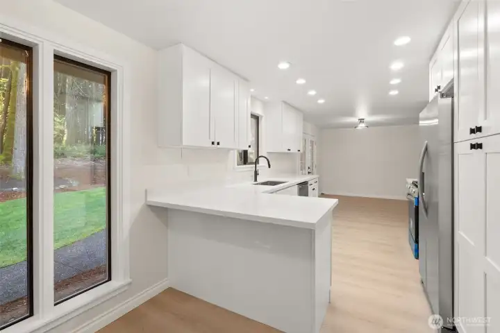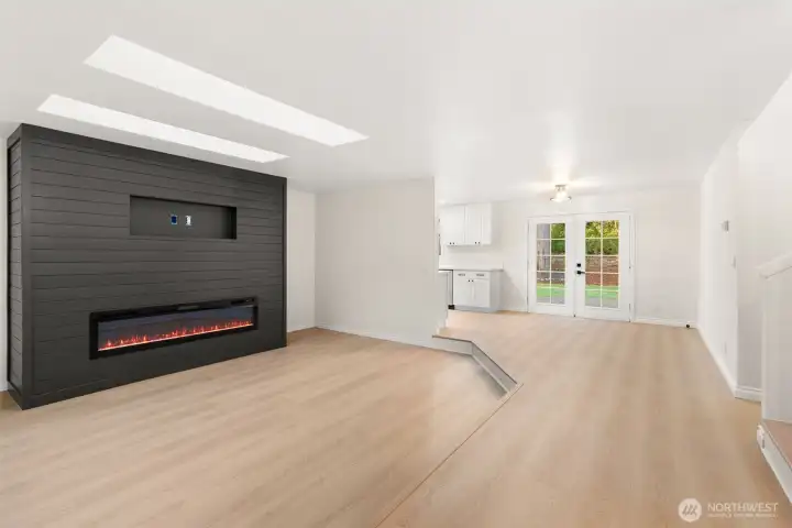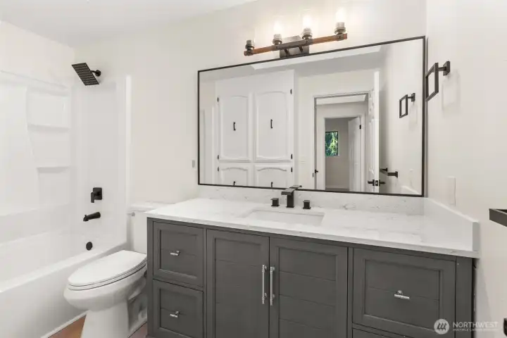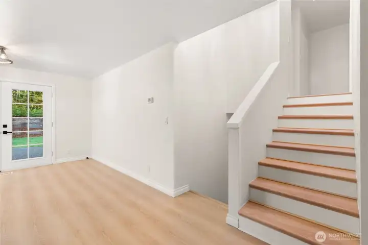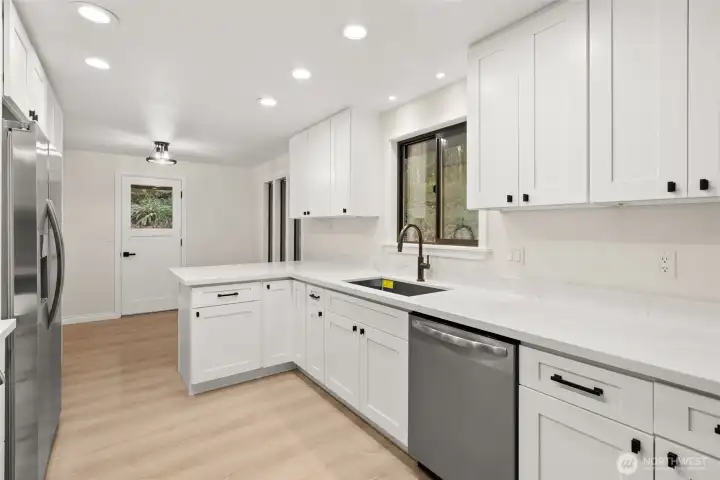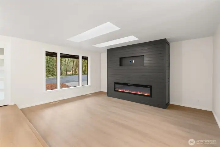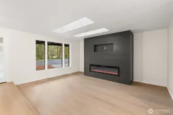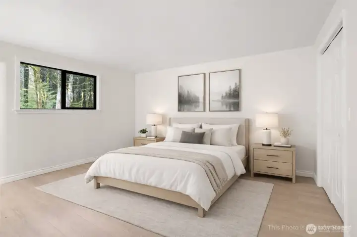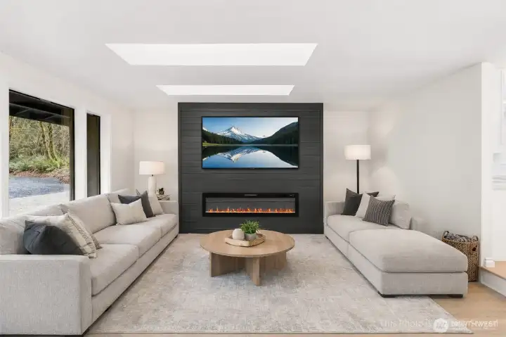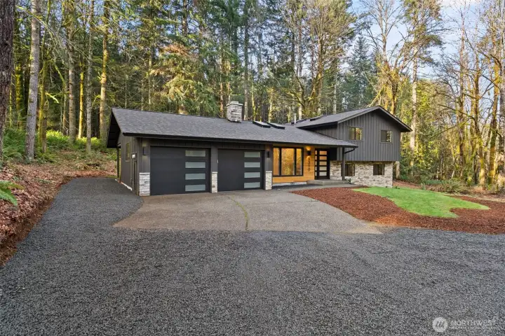Discover the perfect blend of modern luxury and wooded serenity in this beautifully remodeled 2,044+/- sq ft home that sits on a private 1.39+/- acre lot surrounded by mature evergreens, offering exceptional privacy while still bathed in abundant natural light through large windows and skylights. Completely updated from top to bottom, the home features brand-new light oak flooring throughout, a stunning new kitchen with quartz countertops, large peninsula, deep undermount sink, and all-new stainless-steel appliances with a gas range. The open great room centers on a contemporary linear electric fireplace set into a sleek shiplap accent wall perfect for cozy evenings. The primary suite includes a walk-in closet and a brand-new ensuite bath. Two additional bedrooms share a fully remodeled full bath. Downstairs you’ll find a versatile bonus room ideal for a home office or media space. Additional highlights include a brand-new roof, new furnace, fresh interior/exterior paint, two car garage with brand new modern garage doors, new gravel driveway, and low-maintenance landscaping. Enjoy direct access to Capitol Forest just steps away. Conveniently located minutes from Black Lake, Westside of Olympia, shopping, dining, and minutes to HWY 101. No detail overlooked, no updates needed—this turnkey modern retreat delivers privacy, style, and functionality in one exceptional package.